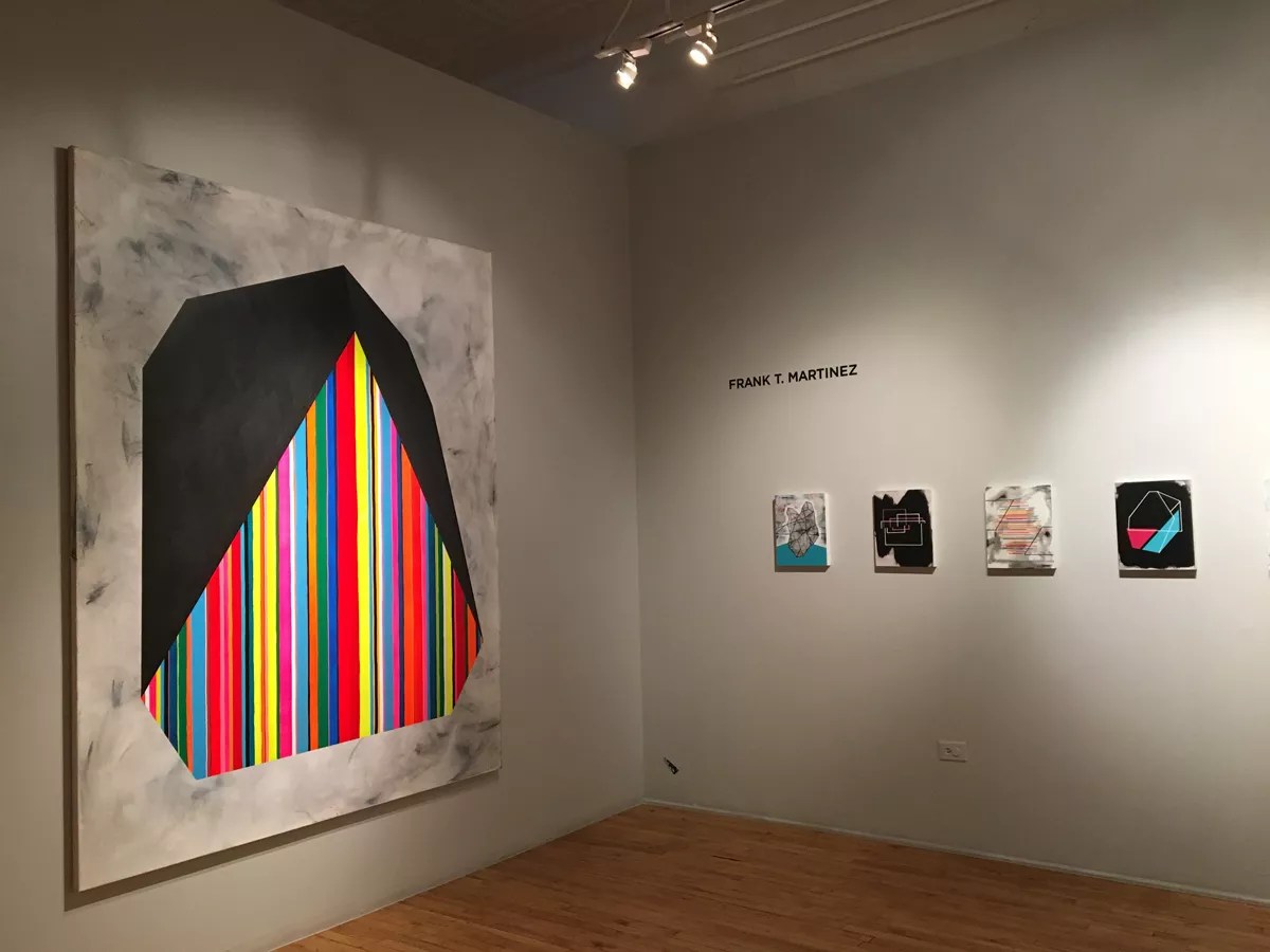 In the gallery to the left, Lucero has installed a set of twenty small abstracts bracketed by a pair of major paintings, all by Frank T. Martinez. The Denver artist has exhibited his non-objective paintings for over a decade; in the past few years, he’s embraced an eccentric version of geometric abstraction in which stripes or other patterns are set against, or held in place by, odd shapes that have been defined by thin painted lines. The small paintings here are studies for the large ones, allowing Martinez to work out details and ideas. They’re more experimental, as he tries out organic lines and dots, and by the time he gets to the final paintings, he’s reduced everything to straight lines and bars on clearly expressed color fields. They work beautifully with Carrejo’s wall installations.