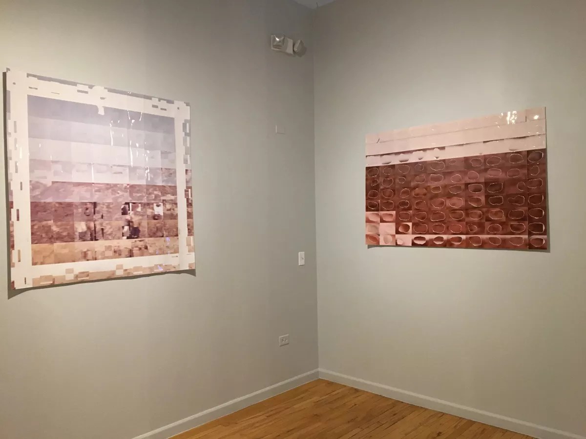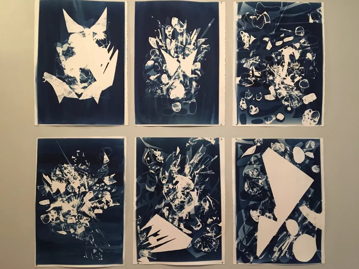 In the large main gallery, Lucero has split the wall space between Denver artists Sierra Montoya Barela and Diego Rodriguez-Warner, who both contribute paintings, more or less. Barela does a kind of neo-pop in which she puts together meticulously painted hyperrealist elements in unlikely combinations, in the manner of a collage. In one, the pictorial content has been split in half, with a lineup of house plants across the bottom, and a watering can and other supplies on a plywood board above. In another, a wedding picture leans against a wall that has a religious mosaic to the right and a sunburst clock above. Rodriguez-Warner, one of the stars of the show, displays an array of paintings on carved wood that show his incredible skill at blending wood carving and painting is such a way that it’s hard to tell where one starts and the other begins. His abstracted figural shapes are based on various traditions from Asia, Europe and the Americas, and he collapses them into a coherent vision that’s uniquely his own. Even in a strong show like this, his work maintains its considerable power. Alejandra Abad’s solar prints. Robert Delaney