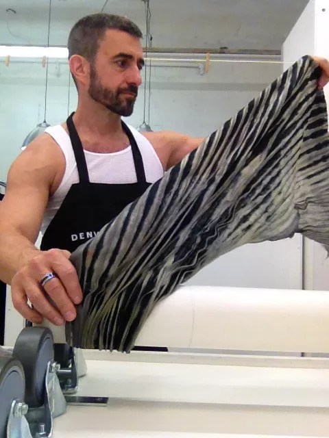 His fabrics go through a series of experiments, starting with the swatches he brings back from textile shows, to see how they react to various processes. “A lot of times, a fabric may not be initially interesting to me, but when I get it in the dye studio, it does really unique things,” he explains. “That’s the fun part of doing the casual line. The unique weave structures react to the dyes in a way that silks never would have.”