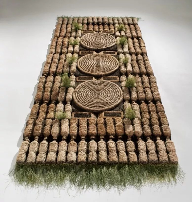 Susan Goethel Campbell, “Flint Carpet,†earth, roots, grass grown in plastic water bottles.