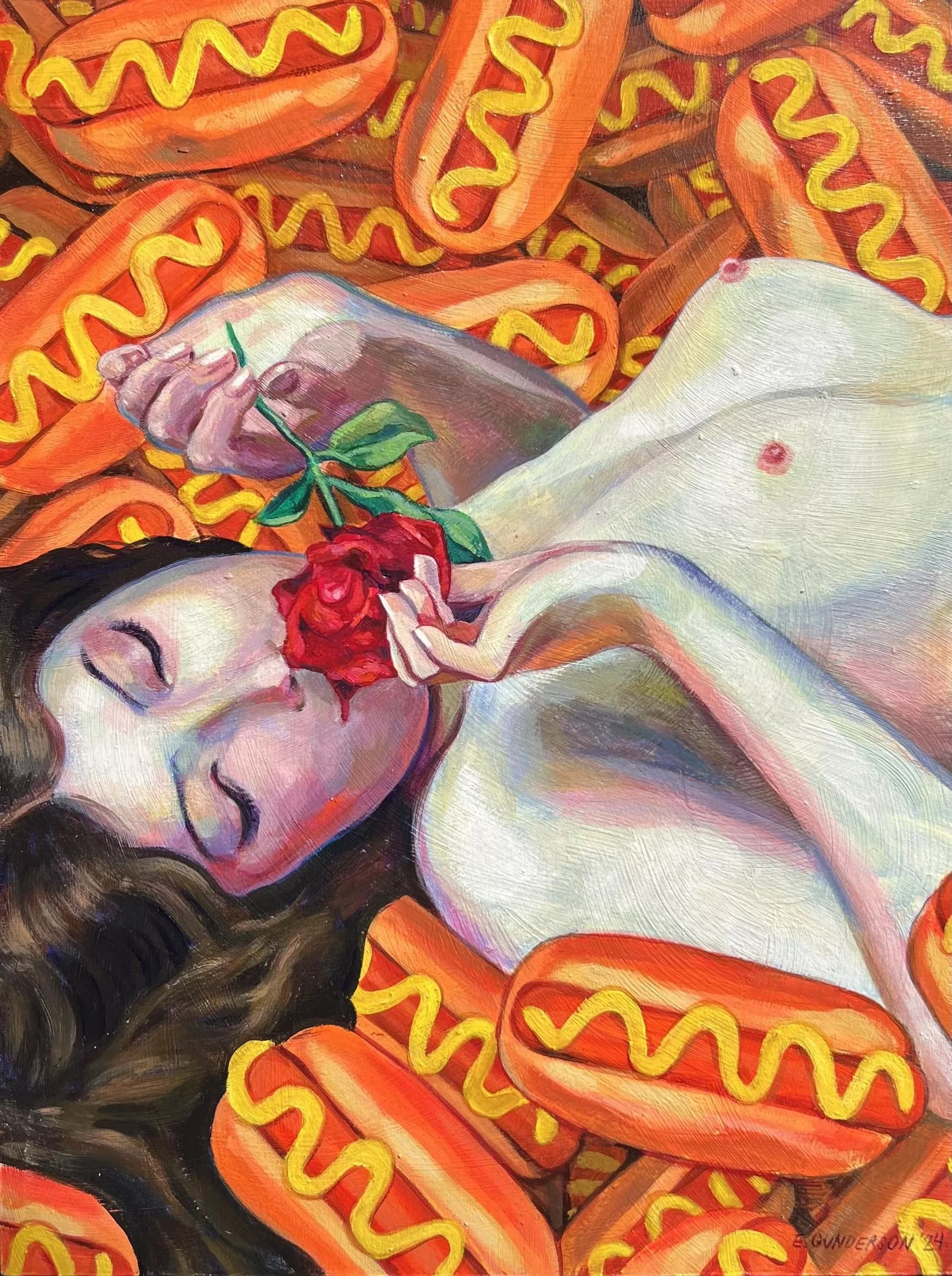It’s always a good day when Elena Gunderson’s over-the-top lowbrow work hits the walls for a Day-Glo-colored show. This one is no different. Gunderson, a lowbrow master, brings out some of her latest: a nude lying on a bed of hot dogs, a smiley-face portrait comprised of a pickle and two olives speared on toothpicks, and a magnificent unicorn with a fast-food luncheon — burger and fries with the works — speared on its horn, to mention a few. This stuff provides the kind of belly laughs that will keep the world’s troubles at bay, at least for a few minutes.