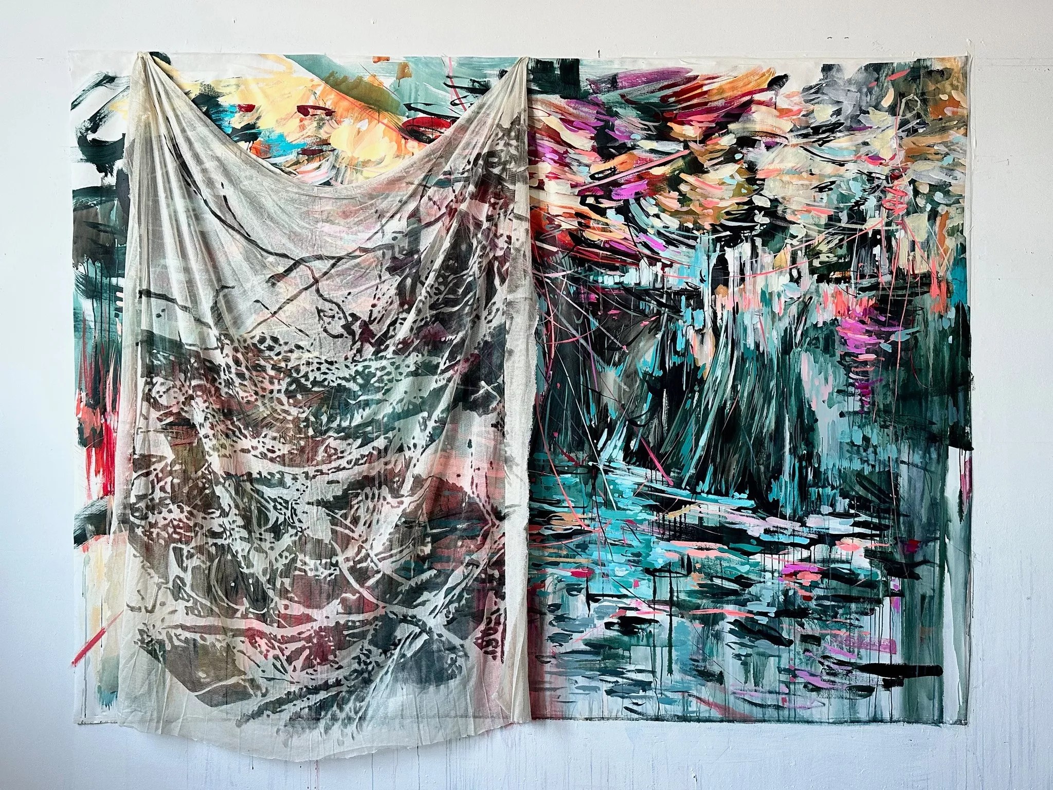 Auricchio’s abstracts begin with densely marked acrylic canvases sparked by movement, but sometimes the paintings go through some changes when layered over with fine theatrical and repurposed fabrics. She can also go a step further by deconstructing her basic abstract designs into wildly active installations that fill a room with explosive expressions.