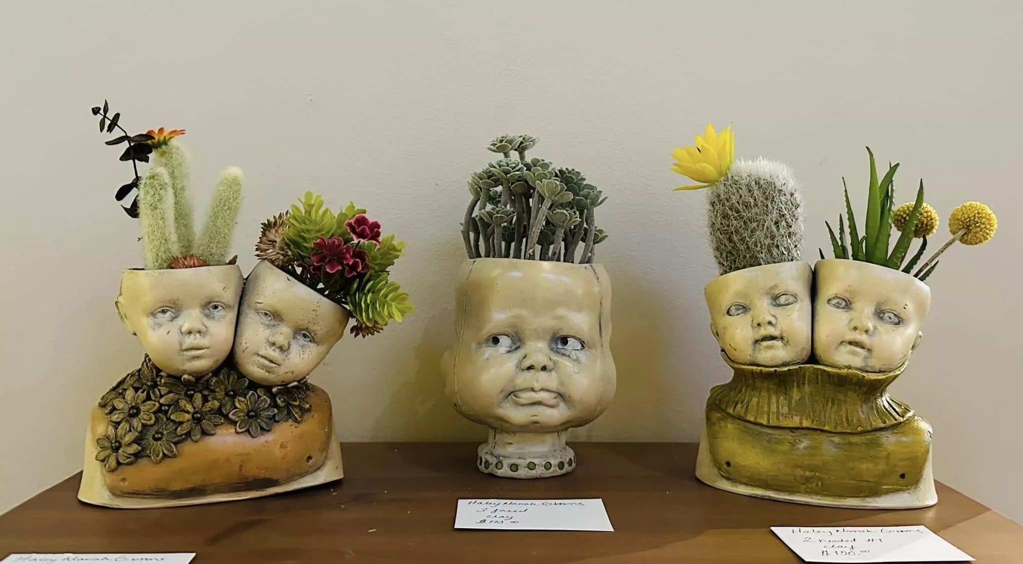 Ceramic planters by Haley Gibbons, in the style of her late mother, Marie Gibbons.