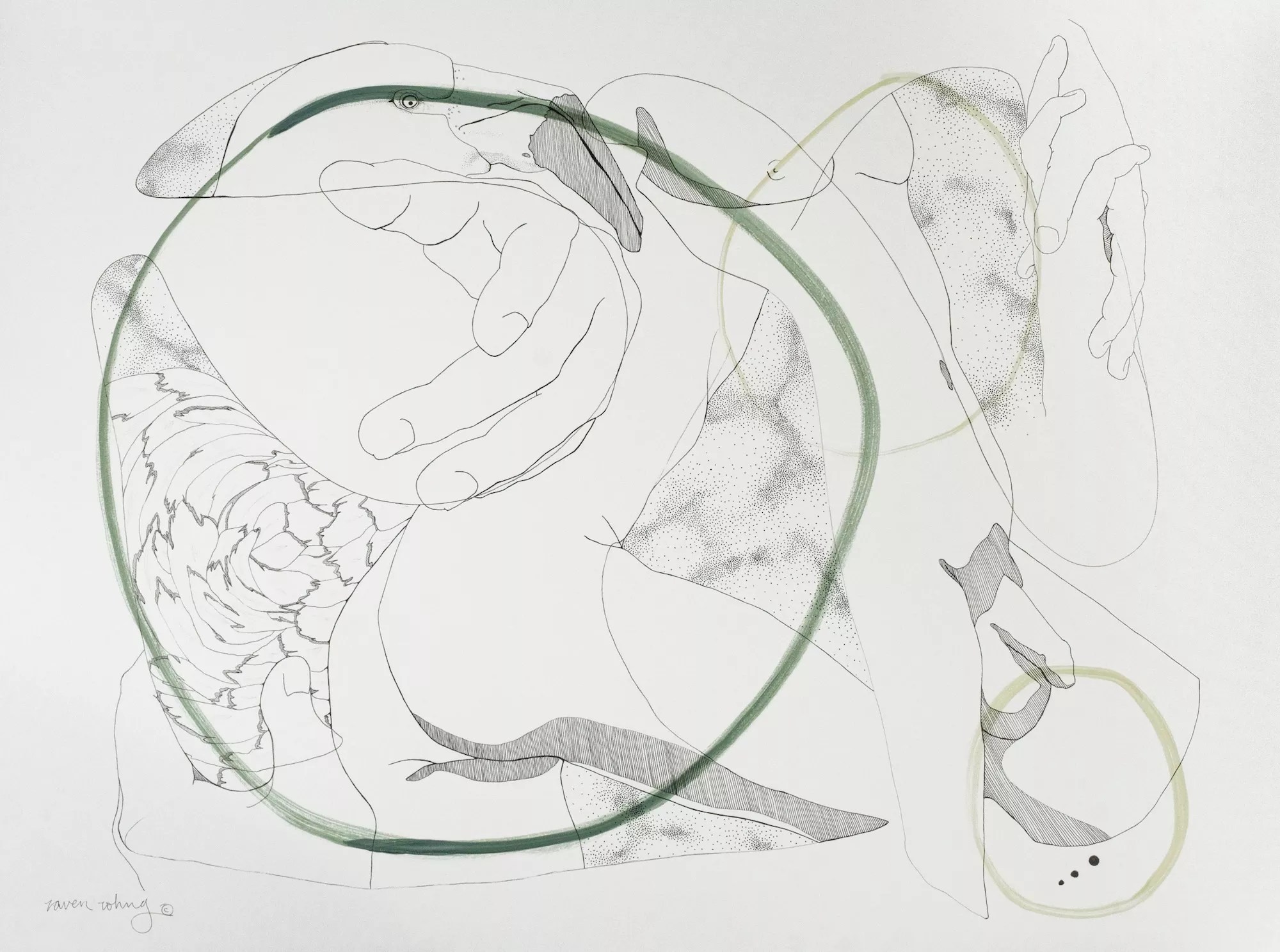 Raven Rohrig’s delicate mixed-media drawings, opening on First Friday at Niza Knoll Gallery, begin with intuitive markings, letting body curves or unfolding chrysalises emerge in simple line compositions. The artist says the finished studies represent coming out as nonbinary later in life.