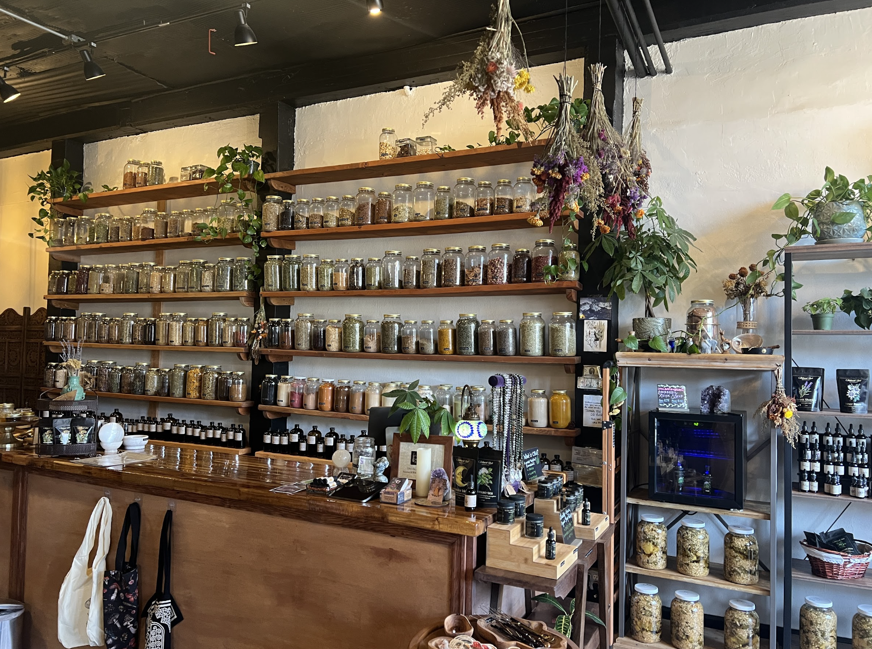 If you are looking for a day-getaway and a more individualist approach to herbalism, head an hour up north to Golden Poppy Herbal Apothecary in Fort Collins. Entering this apothecary is just like the long-awaited feel of the first breeze of spring against your cheek. Guests are greeted with a wooden two-floor collective of herbs in all their brilliance. Sitting along the shelves are herbal smoking blends to clear the mind, locally crafted jewelry and intricately colored altar candles with embedded wildflowers. An extensive naturalists’ bookshelf ranging from the 101s of herbs to the ritualistic nature of the solstices allows for an added touch of comfort located in the back of the store. Golden Poppy embodies the feeling of the seasons with its delicately crafted and full sections focusing on tinctures, elixirs, bath cleansing practices and more. Here the presence of the herbs is not simply an addition to the space, but the entirety of it integrated seamlessly.