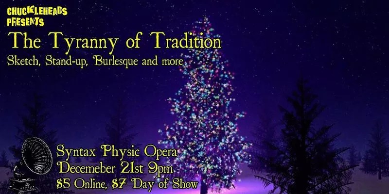 An evening of titillating tickles awaits at the Tyranny of Tradition, a variety showcase packed with enough entertainment gifts to tuck under any Tannenbaum. The comely comedic cavalcade includes standup from Katie Bowman, Anthony Armstrong and Jillian Leigh, new sketches from Gaybies, and burlesque performances from Fuchsia La Fae, Jeanne Vaux and more. Tickets are $5 via Eventbrite and $7 at the door. Visit Chuckleheads Presents’ Facebook events page for more details.