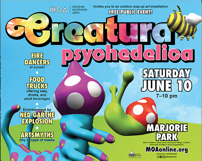 If you’re headed to Fiddler’s Green Amphitheatre for a show this summer, be prepared to encounter a freaky menagerie of giant inflatable bugs posted up for the season in Marjorie Park, on the north side of the concert venue. Hatched from the imagination of San Francisco installationist Bill Kennedy, aka “Inflatabill,” the monumental insects, which are illuminated at night, make up Creatura Psychedelica, a color-splashed summer-long pop-up garden display mounted by the Museum of Outdoor Arts. In between Fiddler’s Green appearances, the portable installation will also travel to other events and places around the state, but not before its Marjorie Park unveiling from 7 to 10 p.m., on Saturday, June 10, at 6331 South Fiddler’s Green Circle in Greenwood Village. The colors of Creatura Psychedelica will be enhanced by a mini-fest of fire spinners, live music by the Ned Garthe Explosion, the ArtsMyths Mask Shoppe and food-truck fare; admission is free. Keep abreast of the migrating insects and their summer travels at moaonline.org.