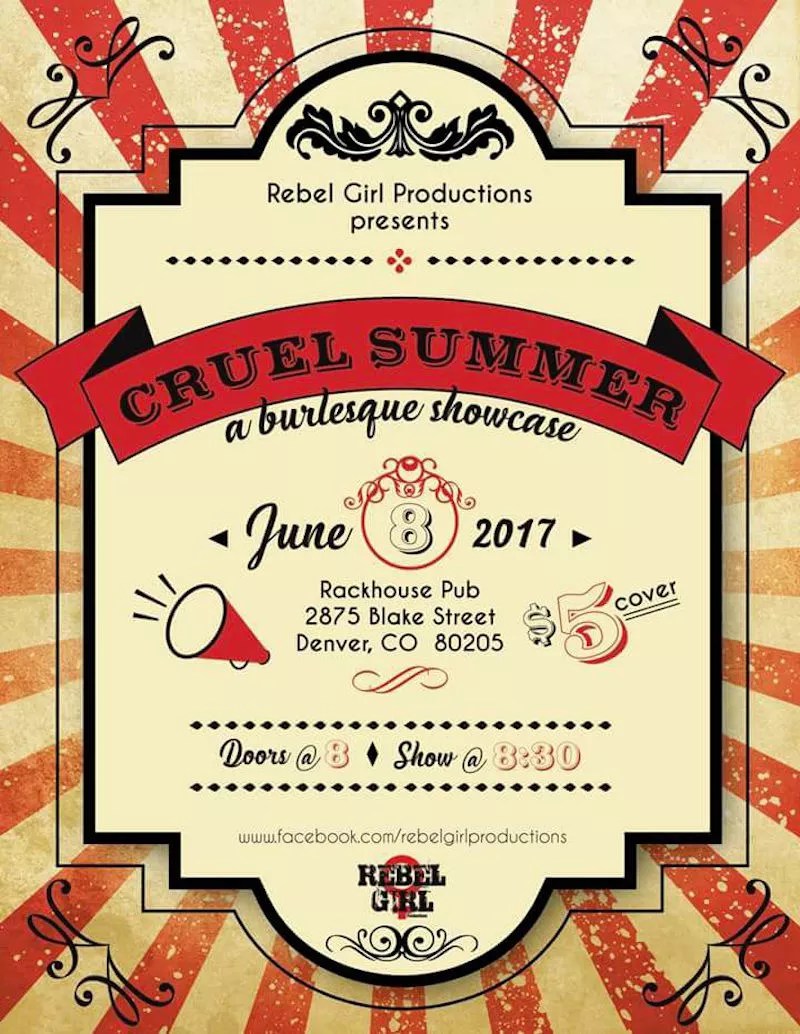 Back in February, two burlesque dancers joined forces to put on a show to raise money for a City, O’ City employee who had fallen ill and didn’t have health insurance. The event was a triumph. Five months later, the same dancers have formed Rebel Girl Productions, a burlesque company that will hold its first show, Cruel Summer, at Rackhouse Pub, 2875 Blake Street, on Thursday, June 8, at 8:30 p.m. The for-profit production will showcase a motley crew of dancers from across the state who are “sure to make you sweat,” according to organizers. Better yet, tickets are just $5. For more information, visit Cruel Summer’s Facebook event page.