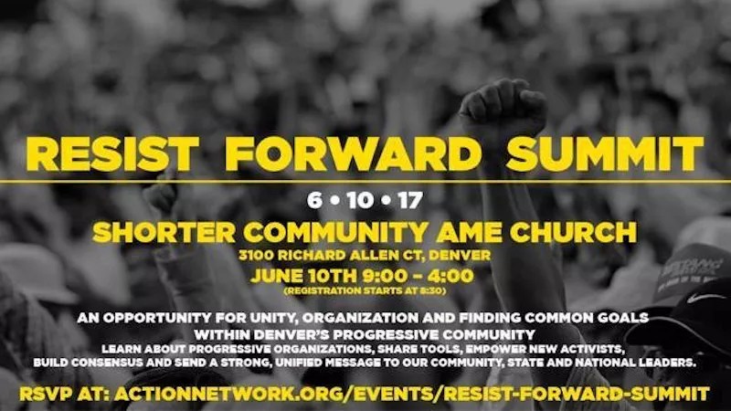 Issues are bubbling up in the new political climate of 2017 faster than we can beat them down. So how do people get together and deal with the barrage of questions about social justice and move forward in unity? Finding common ground is the purpose of the Resist Forward Summit, a daylong collaboration of Indivisible Denver, Dr. Timothy Tyler of Shorter AME Community Church and more than 25 progressive groups in the city. The day includes keynote speakers like immigrant/activist Jeanette Vizguerra, roundtable discussions, and tools and training tips for nonviolent activism, along with some rousing entertainment by the Shorter choir. Get together and talk it through from 9 a.m. to 4 p.m. on Saturday, June 10, at Shorter AME, 3100 Richard Allen Court in northeast Denver. Organizers are requesting a minimum donation of $5 at the door, and lunch will be provided. Space is limited, and an advance RSVP is required. For details, visit the Facebook event page.