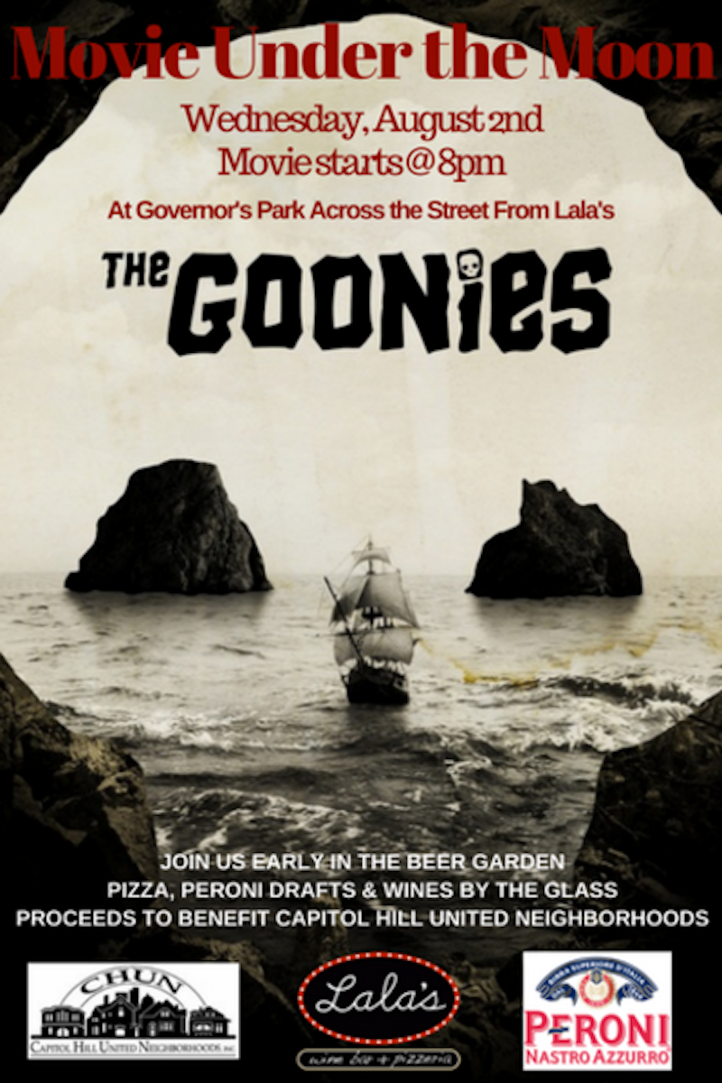 Goonies may never say die, but local cinephiles never say no to a free outdoor screening. Sponsored by nearby Lala’s Wine Bar + Pizzeria – which will serve up sips and noshes at a pre-movie reception- Movie Under the Moon offers guests the chance to unwind in an inviting park flanked by stately mansions. Richard Donner’s classic tale of childhood adventurers may be nostalgic catnip for grown-up ’80s babies, but the film is such rollicking good fun that it’s won over subsequent generations of fans since its 1985 release. The movie starts at 8:15 p.m. Show up early to cool your heels at Lala’s beer garden or secure your viewing spot. Visit Lala’s events page to learn more.