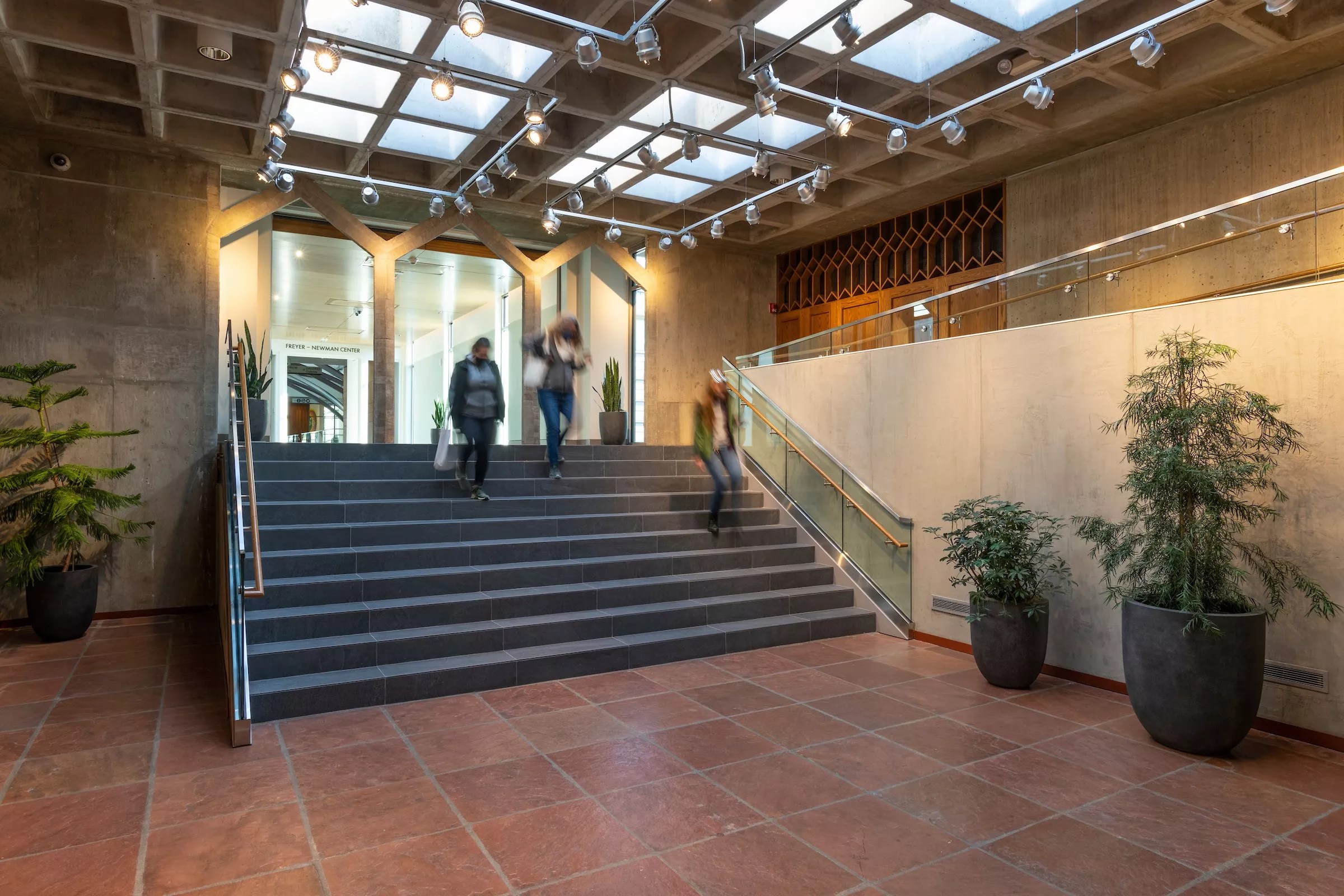 At the top of a dark-gray stone staircase is an open gateway framed by three pointed arches. They’re part of the geometric tree motif Hornbein used, originally serving as the spines of a box window on the north side of the Boettcher. This gateway marks the place where the Boettcher ends and the sky bridge to the Freyer-Newman Center begins.