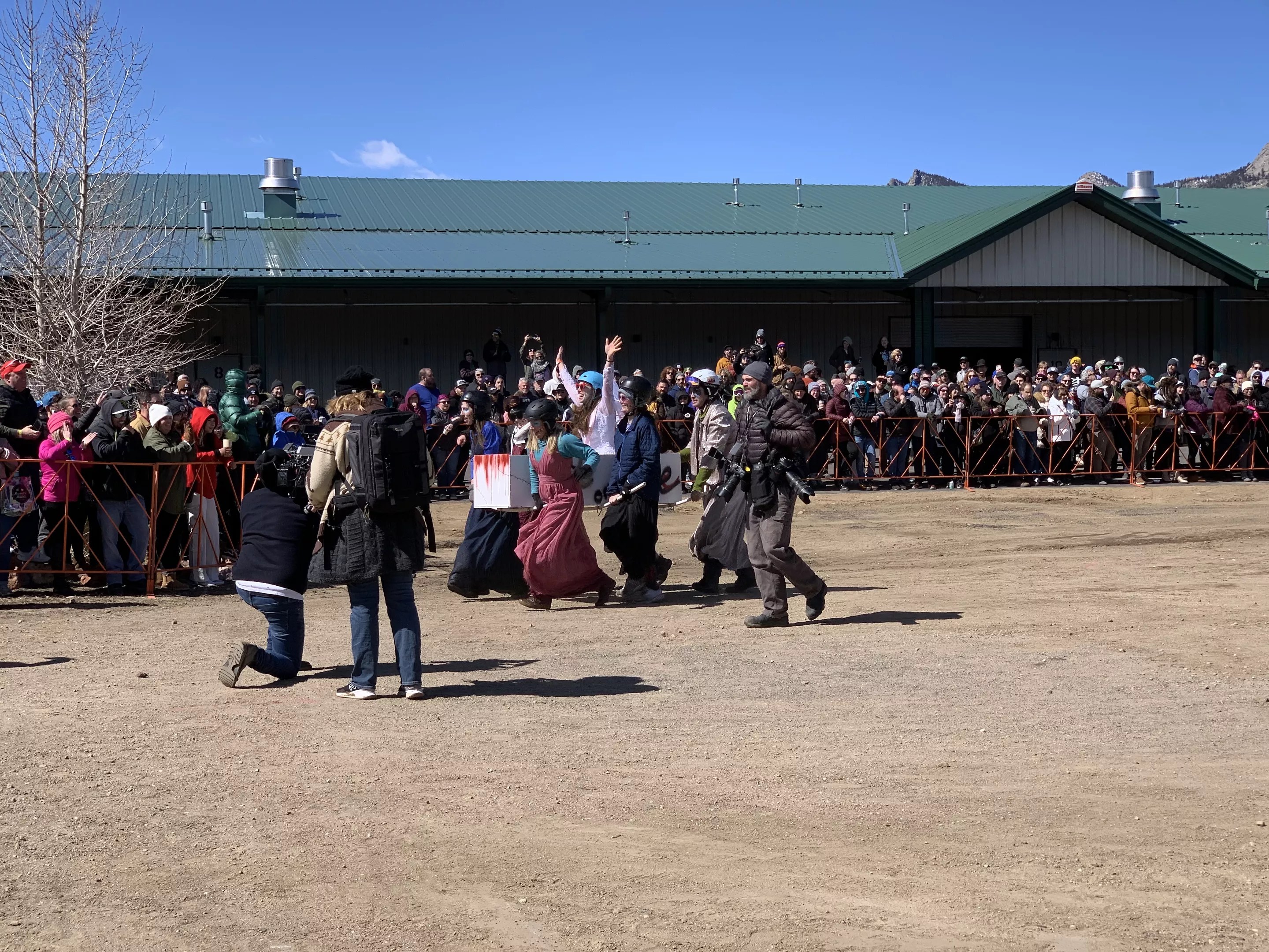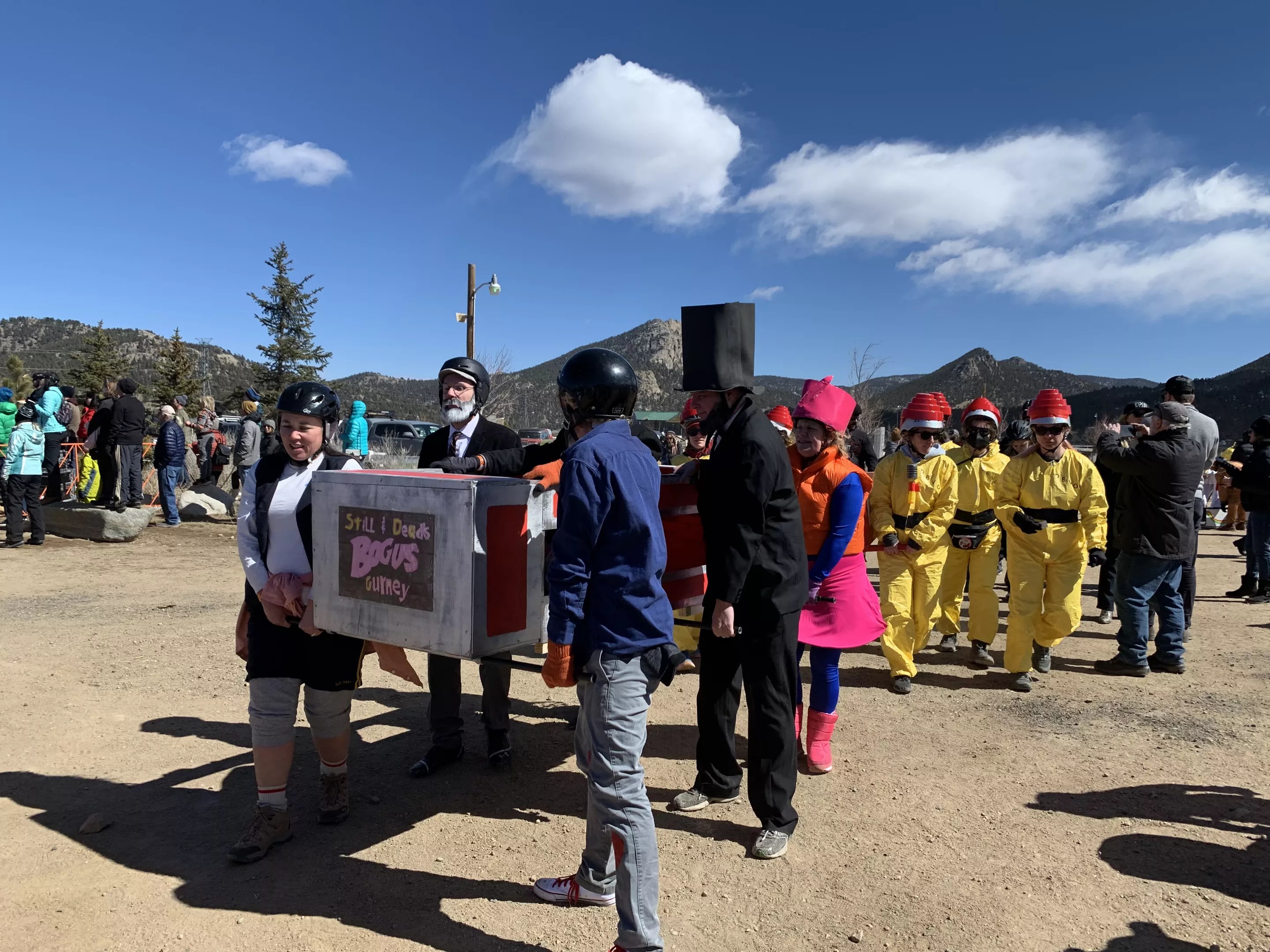 And Hedgepeth would know — he’s been the emcee for the FDGD coffin races for the better part of a decade, and was able to return to that role in Estes Park, along with another longtime emcee, Stephanie Andelman. The coffin races were definitely the star attraction of the festival, with many participants saying that was what they came for. The organizers devoted a large section at the entrance to the coffin race obstacle course, which included a hill for the “corpses” to run up, limbo sticks and a required switcheroo of pallbearers. The atmosphere was less intense competition and more “How ridiculous is this?” The emcees for the event kept up a constant commentary, often heckling and lightheartedly teasing the participants. In one memorable moment, when the “Best in Snow” team’s coffin disintegrated and broke into pieces before it even hit the first obstacle, Hedgepeth joked that the group was being “put down” by its competitors. As a consolation prize, the team ultimately won the prize for “Most Notable Wipeout,” which came with free beer.