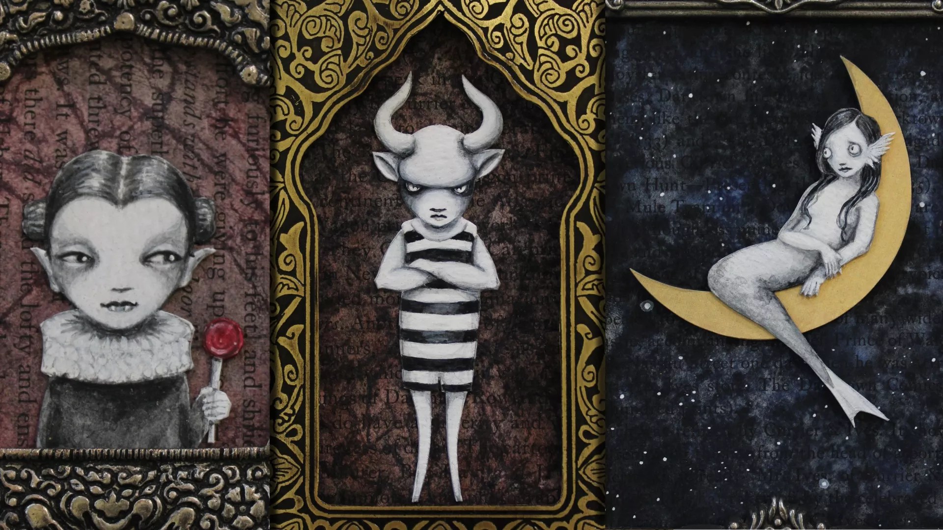 Valerie Savarie brings a new batch of beautiful altered books to her gallery home away from home, Balefire Goods in Olde Town Arvada, along with mini paintings, mini book fliers and prints of creatures and magical beings. Stock up on all your favorite fantasies.