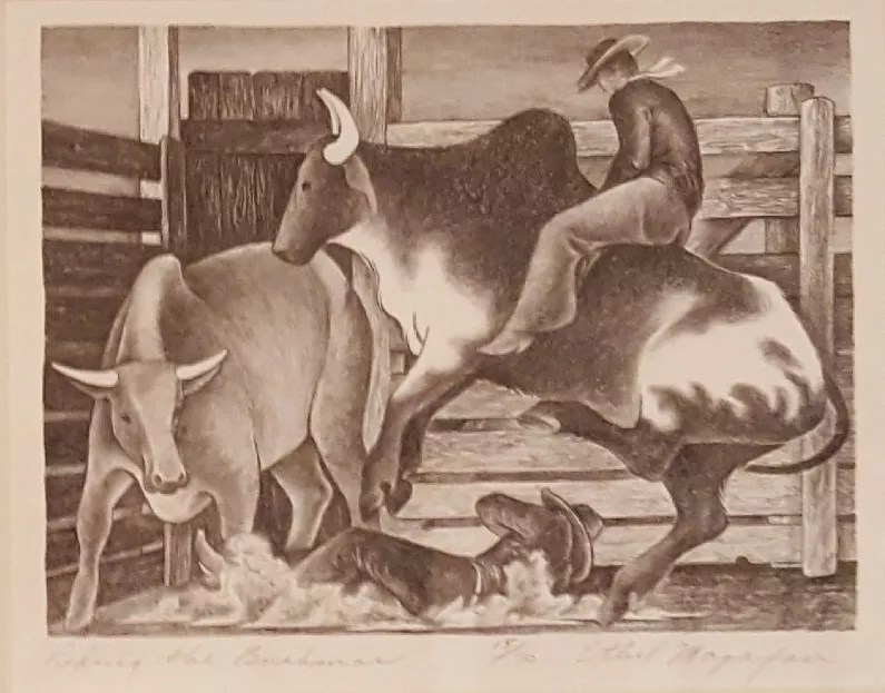 Ethel Magafan, “Riding the Brahmas,” c. 1938, lithograph.