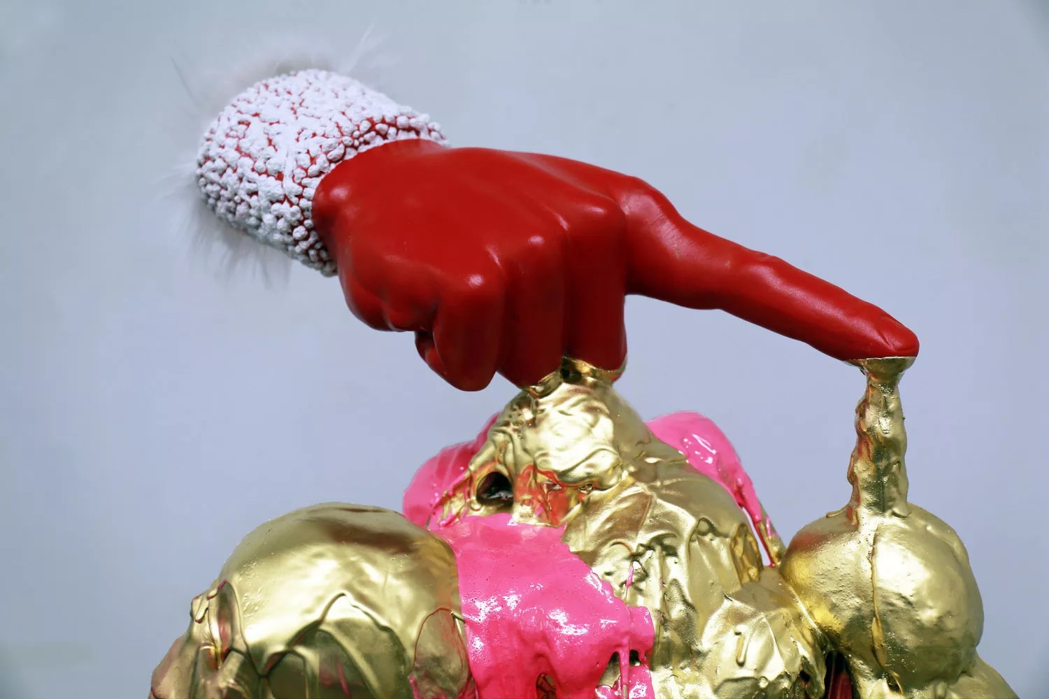 Yoshitomo Saito, Woven Karen Kitchel, “Larger Than Life #5 (detail),” Oil on panel. Karen Kitchel