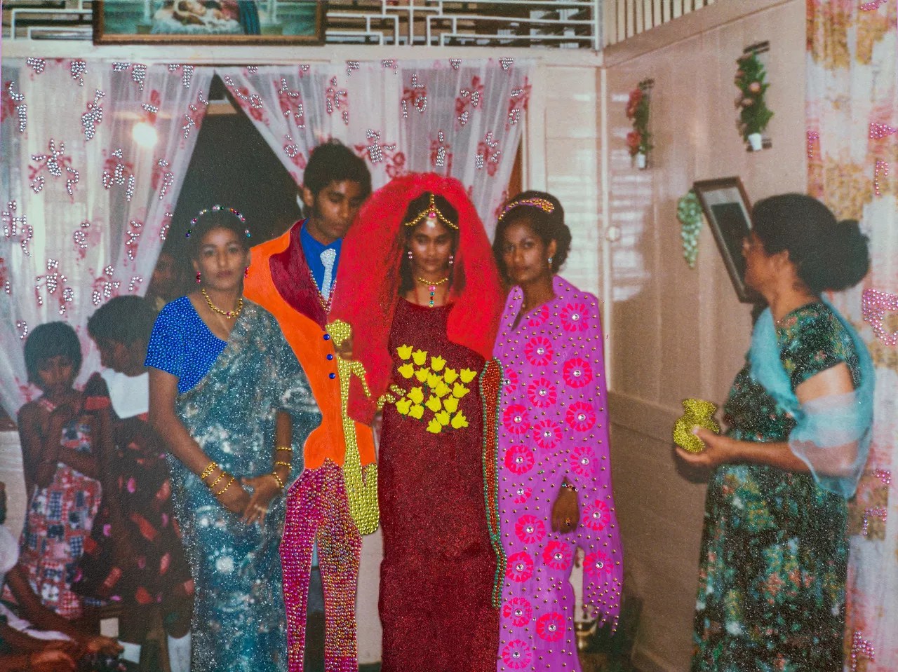 Renluka Maharaj’s photography-based practice crosses mediums and cultures in posed photos and bright bead-embellished pigmented prints that revive scenes from her post-colonial heritage as an Indian born in Trinidad and Tobago. Politics and history broil beneath Mahara’s colorful portraits.