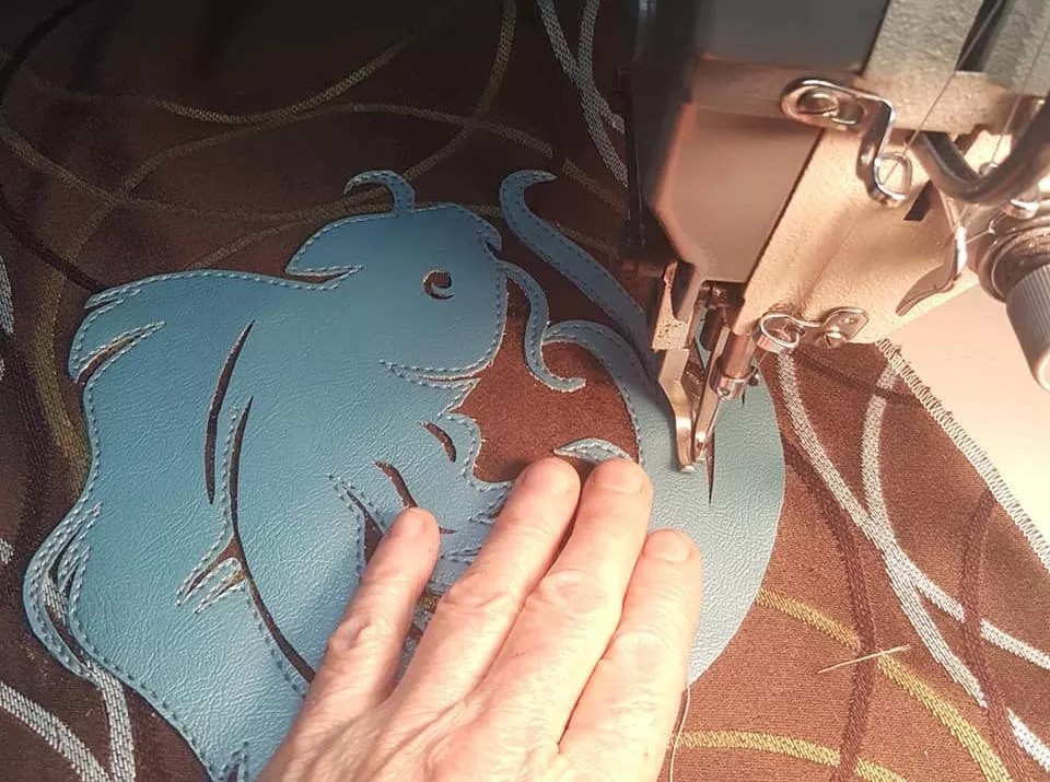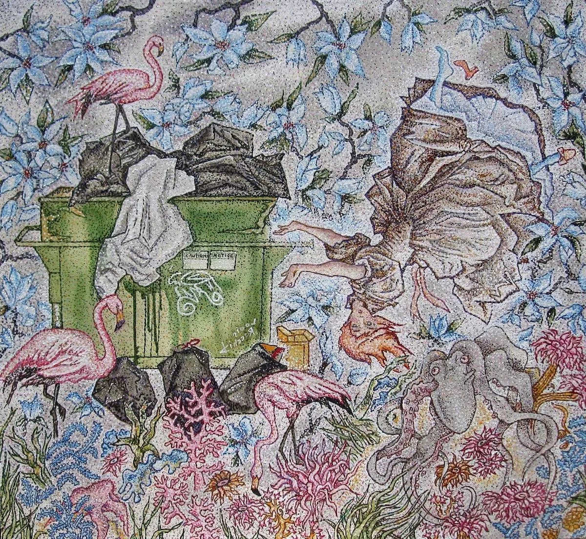 Louis Recchia Solo Show Jill Mustoffa stitching up a retro fabric collage. Jill Mustoffa
