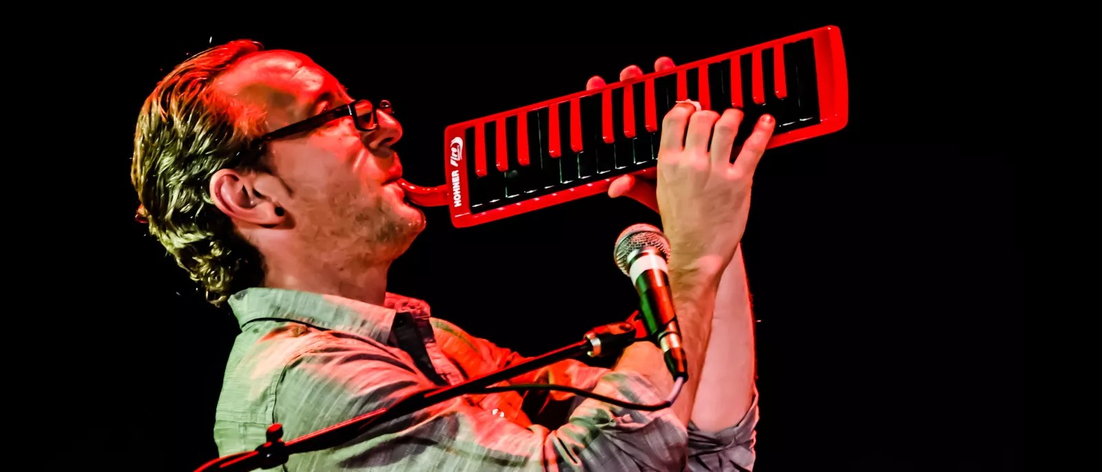 Gary Grundei playing a toy piano with guitarist Janet Feder.
