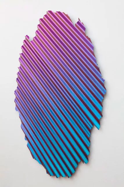 A different approach to time is conveyed by “Portal,” which is made of corrugated steel. It captures the idea of eternity: The overall shape is complex, like an island’s shoreline, and that complexity is jacked up by the peaks and valleys of the corrugation, as well as the chameleon paint it’s finished in. This kind of pigment changes color both as it follows the contours of the steel and as viewers move past it. For “Portal,” Obergfell used the type that goes from blue to purple and back again.