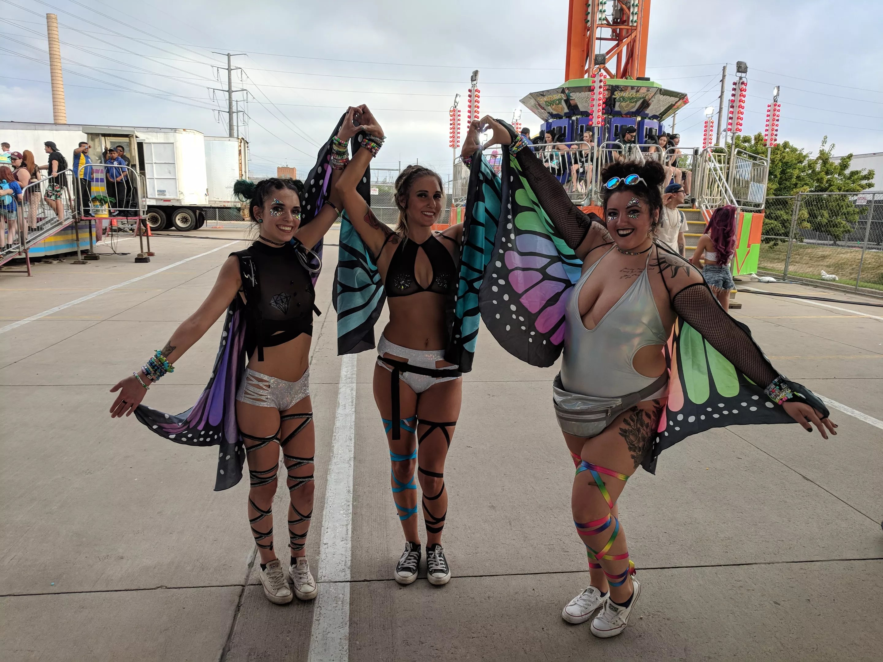 A trio of butterflies traveled to Denver from the Midwest for the fest. Ashley Howery accessorized her outfit with gems and jewels around her eyes; she also wore kaleidoscope glasses that turn what you see into a wonderland. Kaleidoscope glasses were definitely on trend at the festival. Mauricio Rocha
