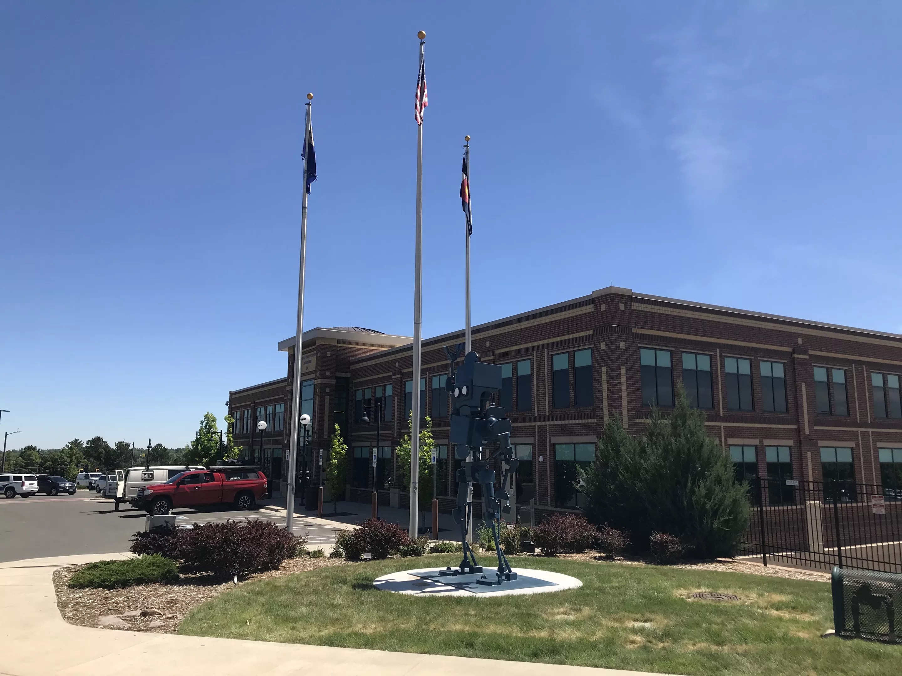 Chris Mora’s massive robot sculpture sits outside a Douglas County Sheriff’s substation in Highlands Ranch.
