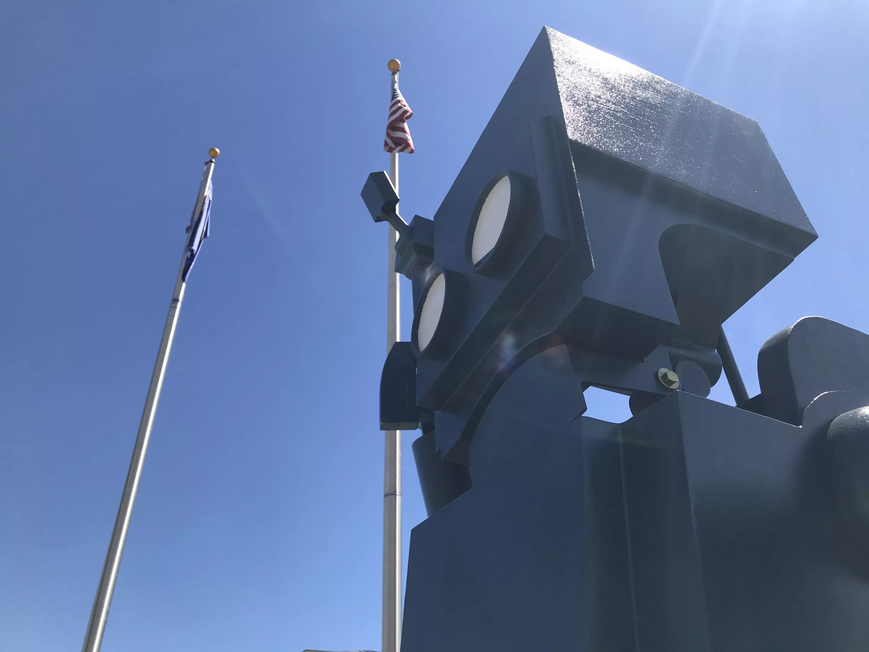 The trio looks tired, having spent the better part of a hot morning putting up the sculpture and wondering what the deputies in the building will think of the grumpy ‘bot. Surrounded by a tactical bag full of tools, a welding mask and other sundry items, the three look a bit like undercovers fresh off a mission: sweaty, disheveled and ready to go home.