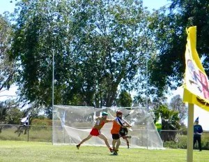 As O’Haire details these rules, a player named Trina – the only woman who competes for the Gaels because she played at Trinity University in Dublin – directs a ball past the Regulators’ goalie into the bottom half of the H-shaped goal. That’s three points for the Gaels; if she had scored above the net, it would have been only one.