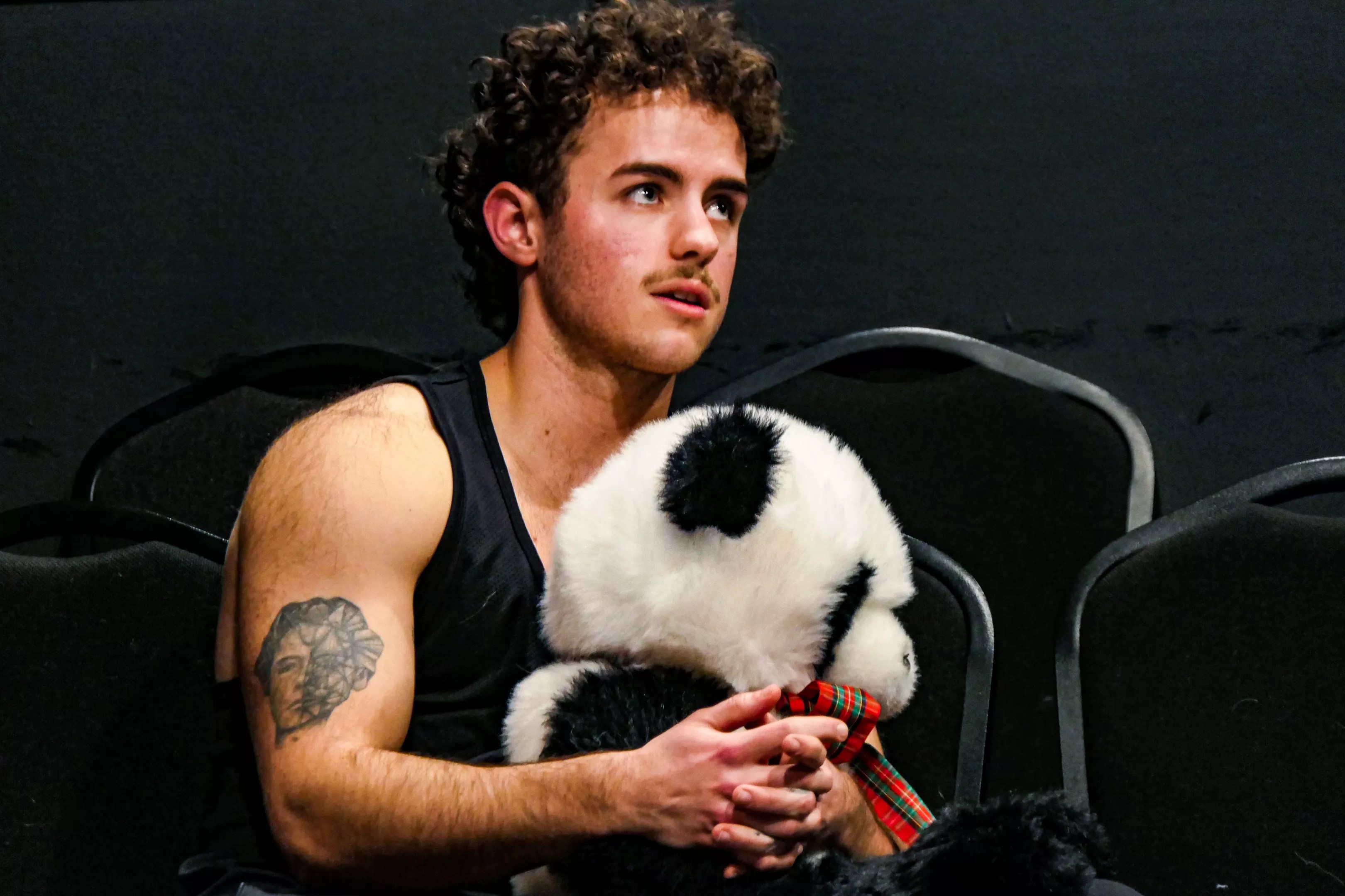 Clutching his emotional support teddy bear, Wes Mysinger stars as Mark in Off the Gradient.