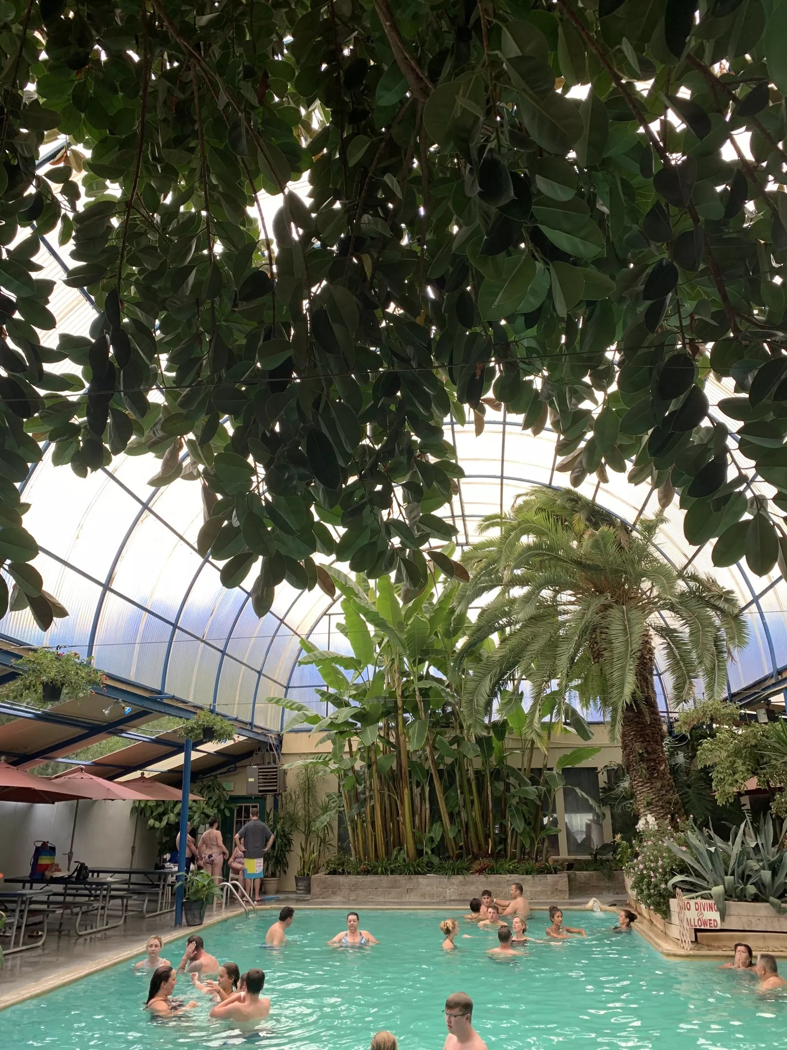 Today, Indian Hot Springs offers several bathing options, including the mineral hot springs pool, the geo-thermal caves, outdoor Jacuzzis, indoor private baths and mud baths. The main pool, which is the most popular choice, is filled with 115-degree water, reportedly giving the pool an average temperature of between 90 to 100 degrees. It’s surrounded by lush plants and shrubbery, including banana and palm trees.