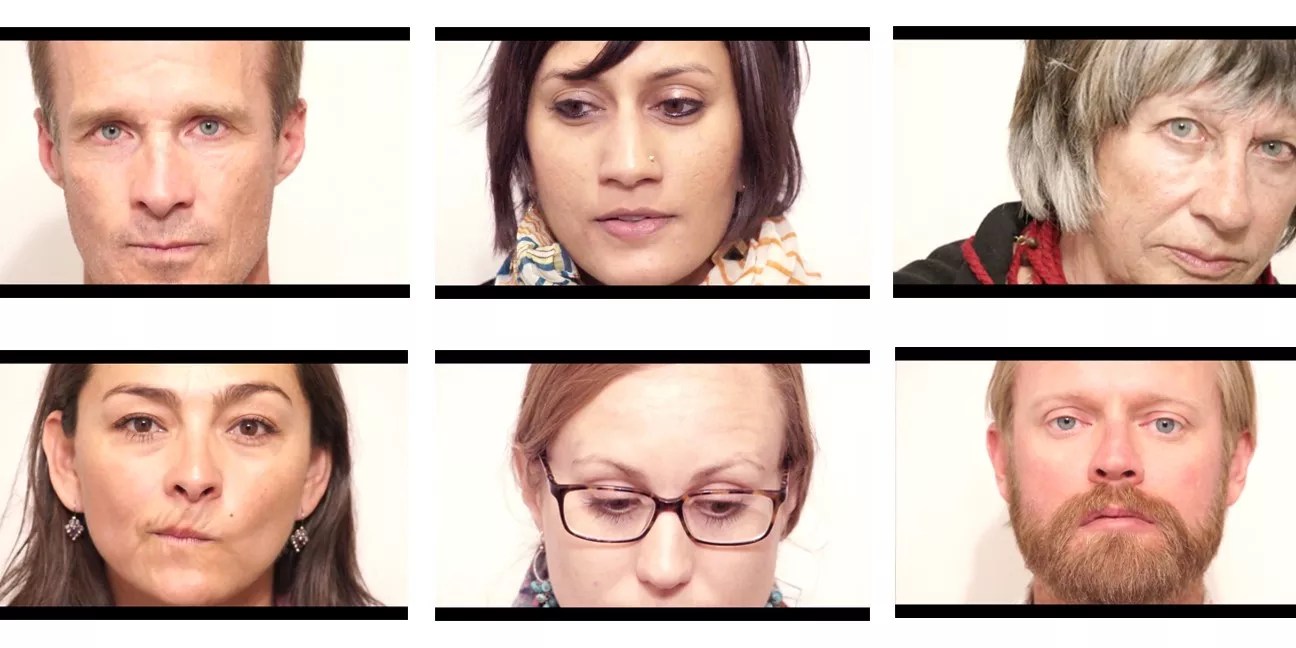 The video, which is entirely silent and runs thirty minutes, shows the faces of forty people going through this hypothetical scenario. Their non-verbal gestures and expressions that define the exchange are what the audience experiences.