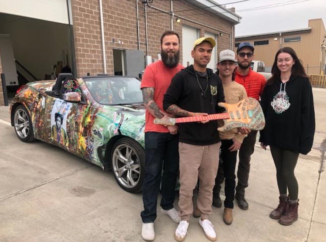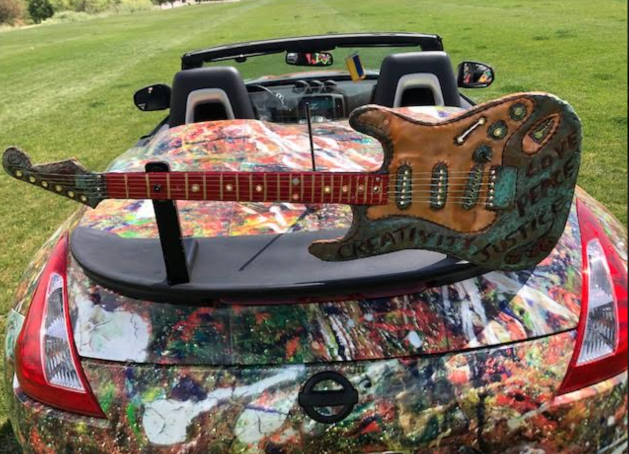 The “Hendri-Z” art car is a 2010 Nissan 370Z convertible that displays four original abstract pieces of art inspired by Hendrix, with a copper sculpture of a guitar mounted on the back hood. The guitar sculpture, created by Mark Noll, is modeled after the Fender Stratocaster that Hendrix played at the Monterey Pop Festival in 1967. The paintings that adorn the “Hendri-Z” were done by Michael Freeman, then digitized by Adam Carnesis and applied to the vehicle by PureBlind Wraps & Graphics. The project took over two years to complete, and began at the start of the pandemic.