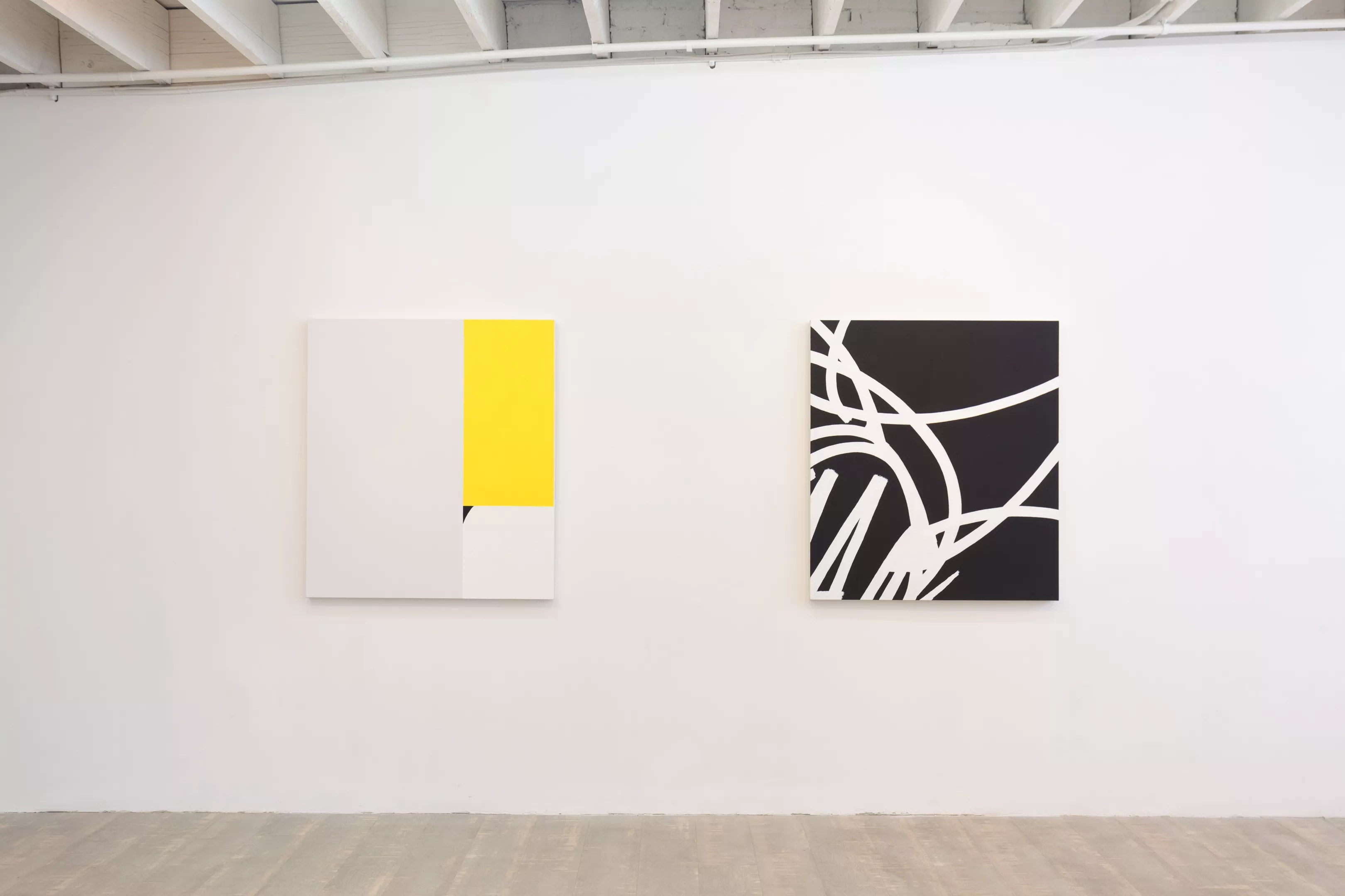 For the last three paintings, Coniff introduced the color yellow, as seen in “Including Yellow,” in which a blown-up version of a fragment of a flower runs across the bottom, while the top has a yellow rectangle on the left, and a tighter, and therefore bolder, detail of one of the flowers, on the right. The details have an abstract expressionist quality, with the passage on the top right in particular looking like it’s in homage to Franz Kline. “Including Yellow (in detail)” turns the composition into a geometric abstraction, with two gray blocks of color adjoining a yellow one. Only a tiny curved wedge of black refers back to the flower image. The rectangles of color represent a tip of the hat to minimalism, with this stylistic touchstone being carried to its ultimate expression in “Including Yellow (in full detail)” which is nothing other than an evenly painted yellow field.