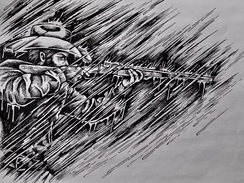 A pen-and-ink drawing from Finley’s Cartoon Western series, 2017.