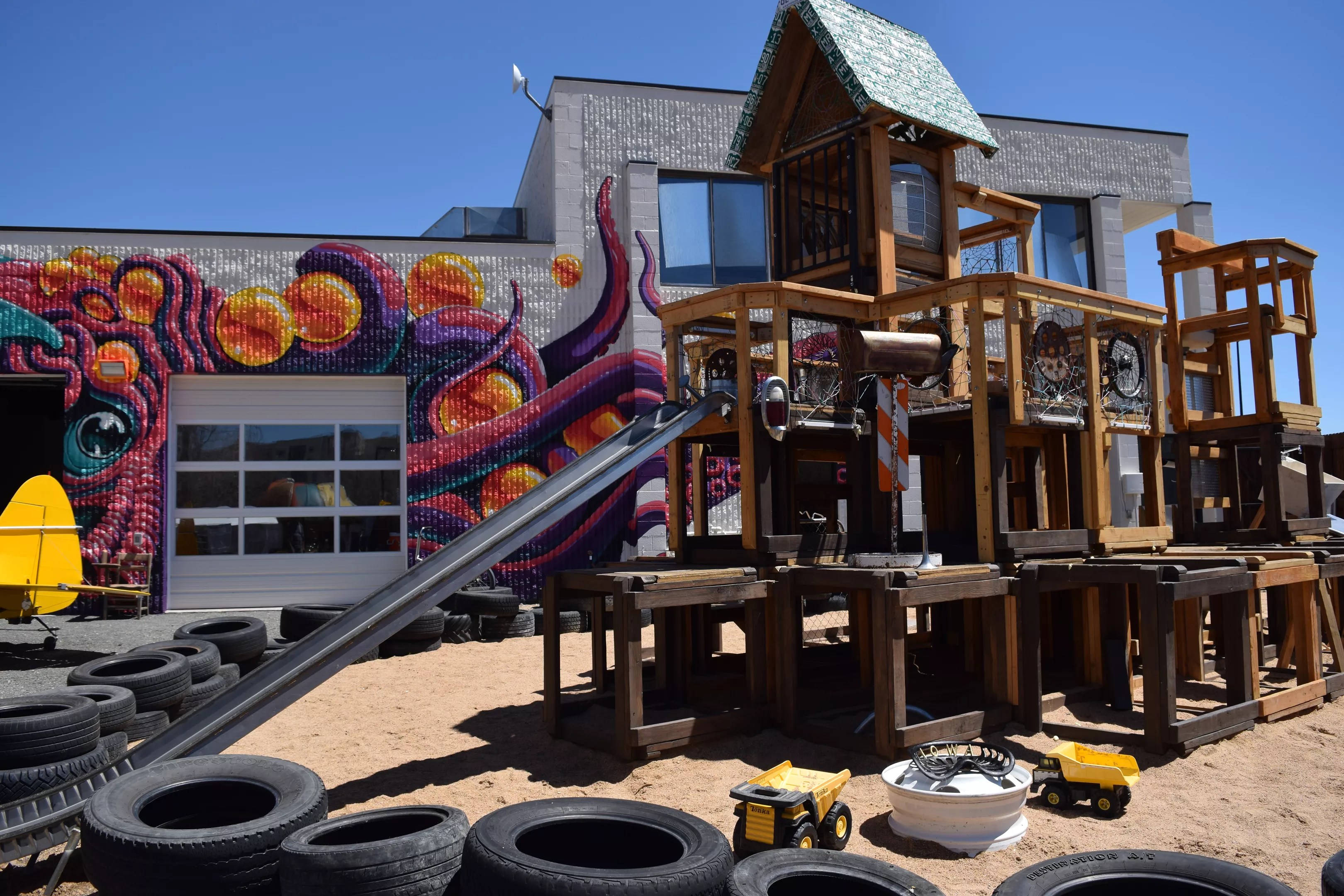 Behind this giant slide, Junkyard Social Club will house a cafe and classroom.