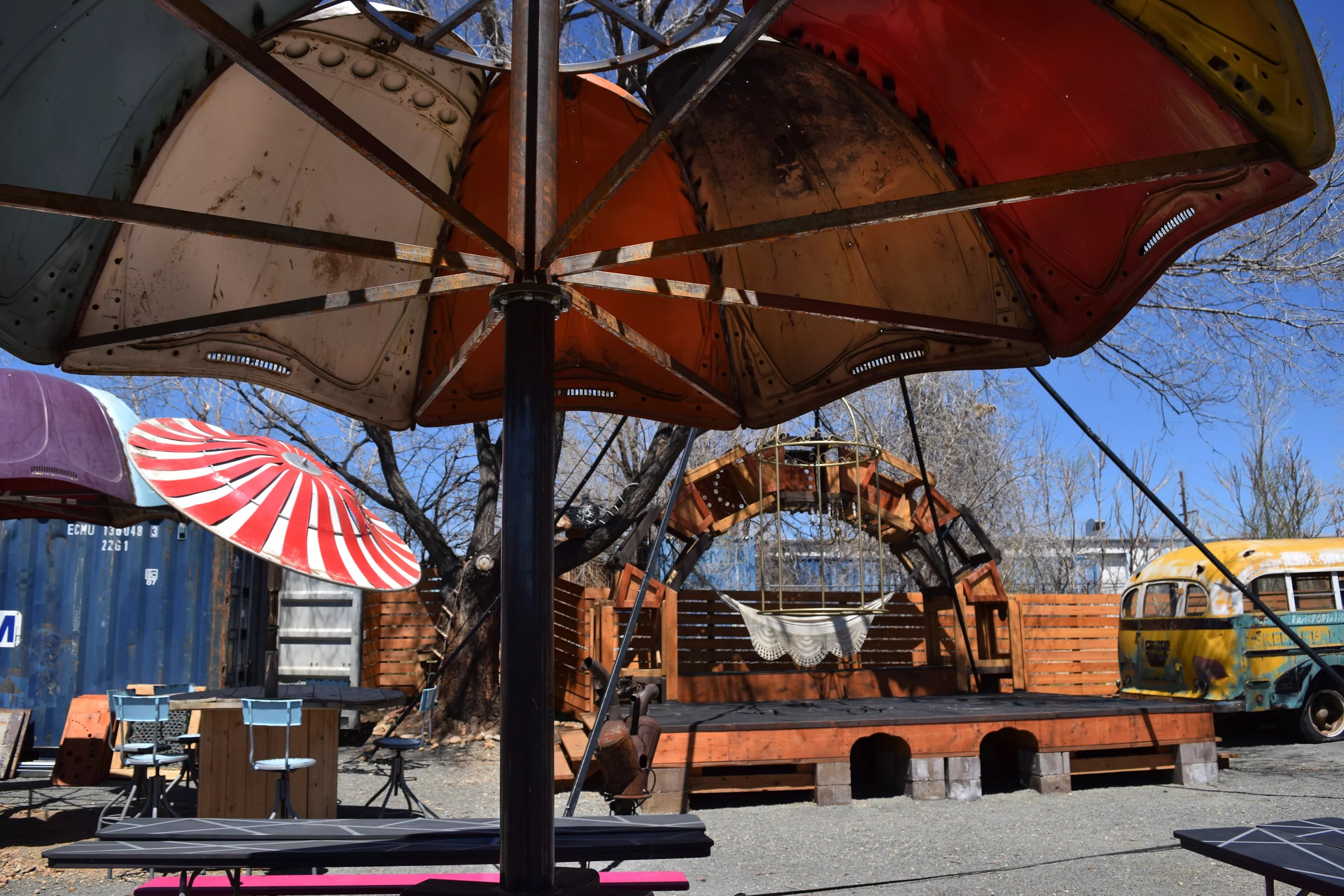 This table’s awning is built from old VW hoods. In the background is the stage for performances and impromptu play.