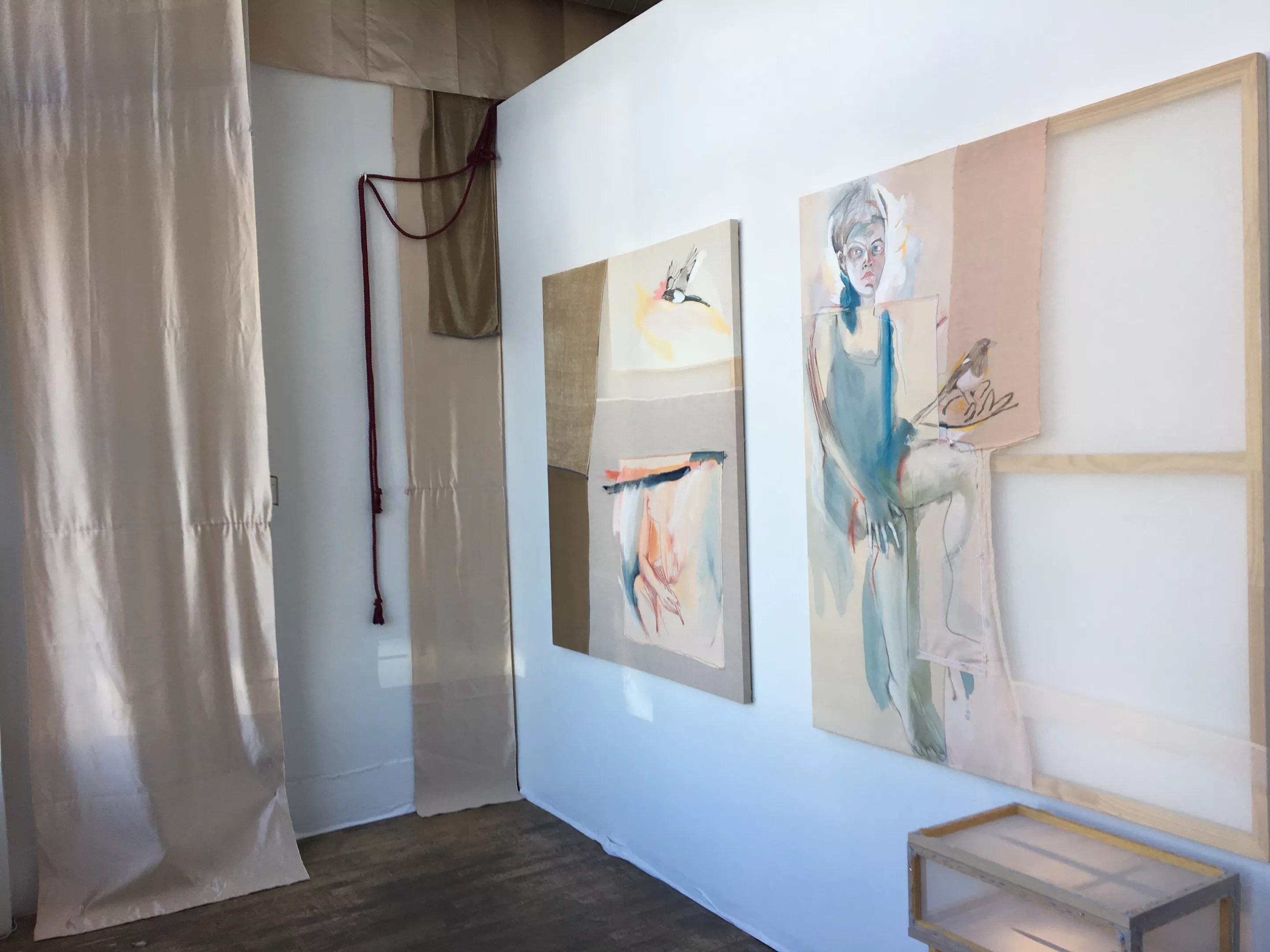 Tucek’s intentions with this work are economically laid out in the installation at the entrance. The east wall is covered with layered drapes, with a braided cord tipped in tassels poetically looped like a tie-back on one side, reminiscent of those backdrops in Gentileschi’s works. Adjacent are two paintings, “Melancholia” and “Rasa,” both of which have surfaces not of stretched canvas, but of sewn-together pieces of fabrics, including satin, chiffon, linen and even a little velvet, extending the drapery reference from the wall to the paintings. In “Melancholia,” there’s a magpie and a partial nude female, both done in acrylic and pastel; “Rasa” is a self-portrait in which the artist is seated, a magpie in her hand. Most of the surface of “Rasa” is done in chiffon, so it’s essentially transparent, with the underlying stretcher bars drafted into service as part of the picture. Tucek’s style of rendering has a fresh, quick-sketch quality, lending the pieces an air of spontaneity even though they must have been time-consuming to make. Finally, there’s a “table” – actually the skeleton of a cabinet with its top and sides made of stretched chiffon – that would collapse with the slightest touch. Inside is a dagger, visible through the gauzy chiffon and lit by a spotlight on the floor.