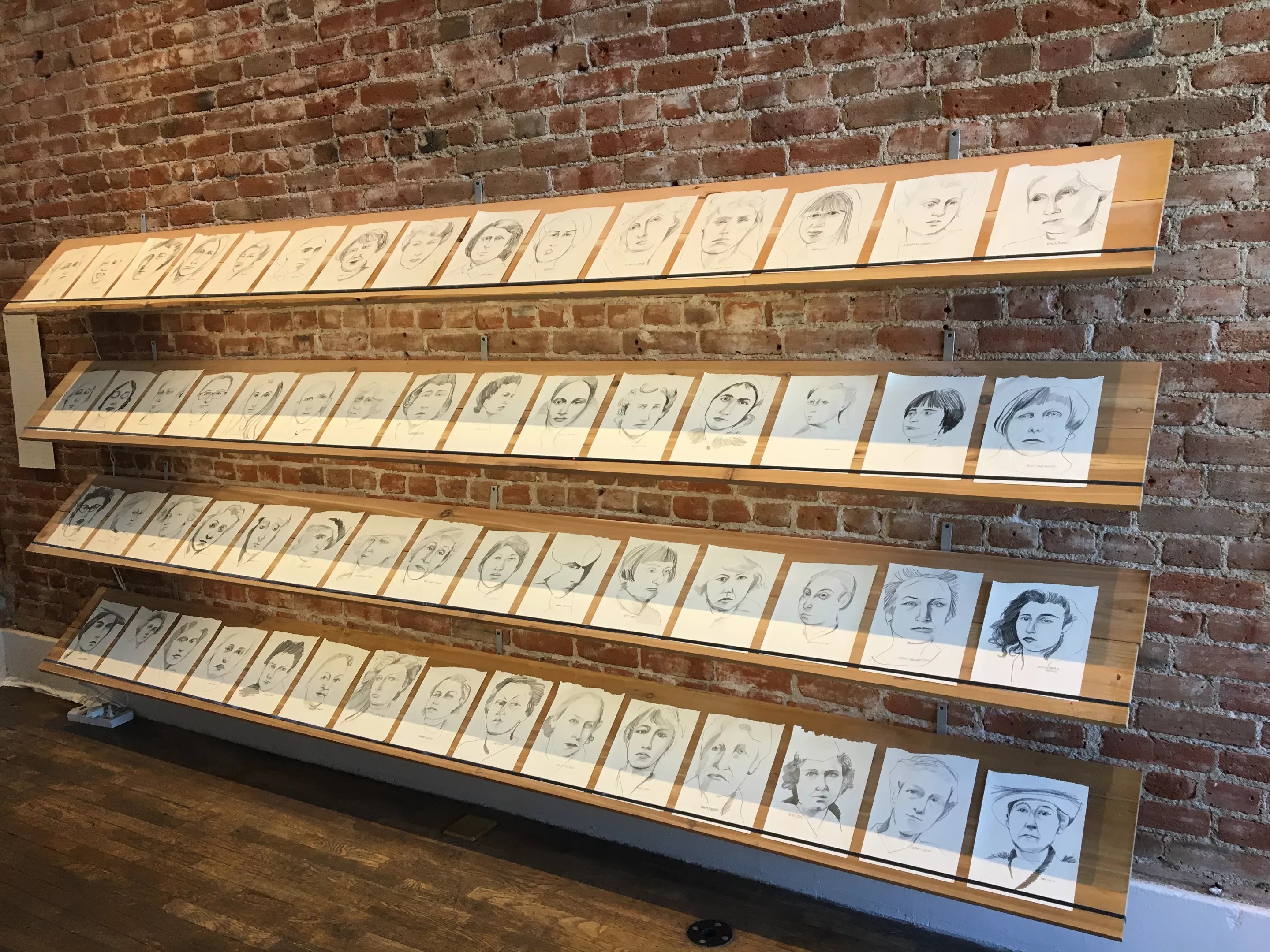 Finally, there’s an elegant little show-within-the-show: a set of angled display shelves with rows of portrait drawings of dozens of all but forgotten women artists, many of whom Tucek only discovered in doing research for this show.