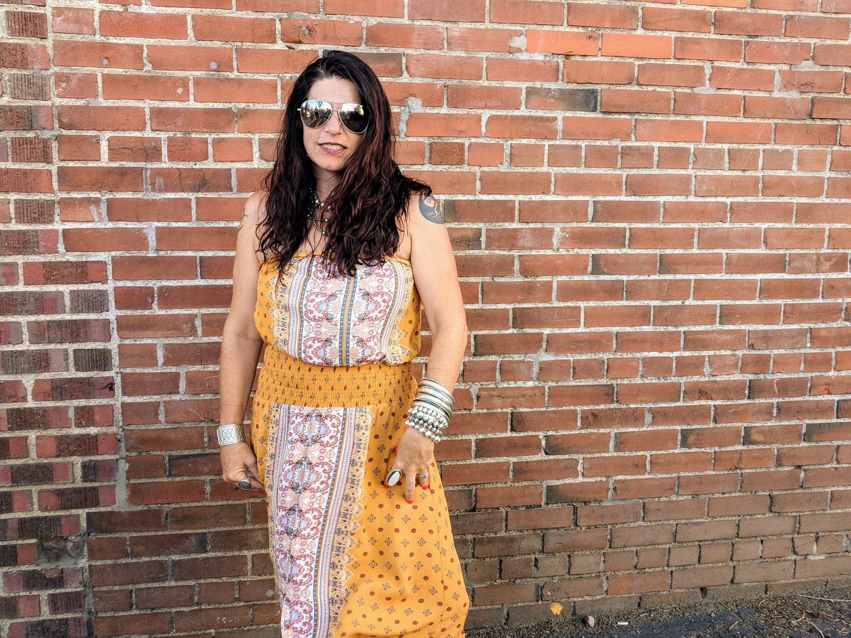 Bloome wears a yellow bohemian dress with silver accessories and brown suede fringe sandals at the Westword Music Showcase.