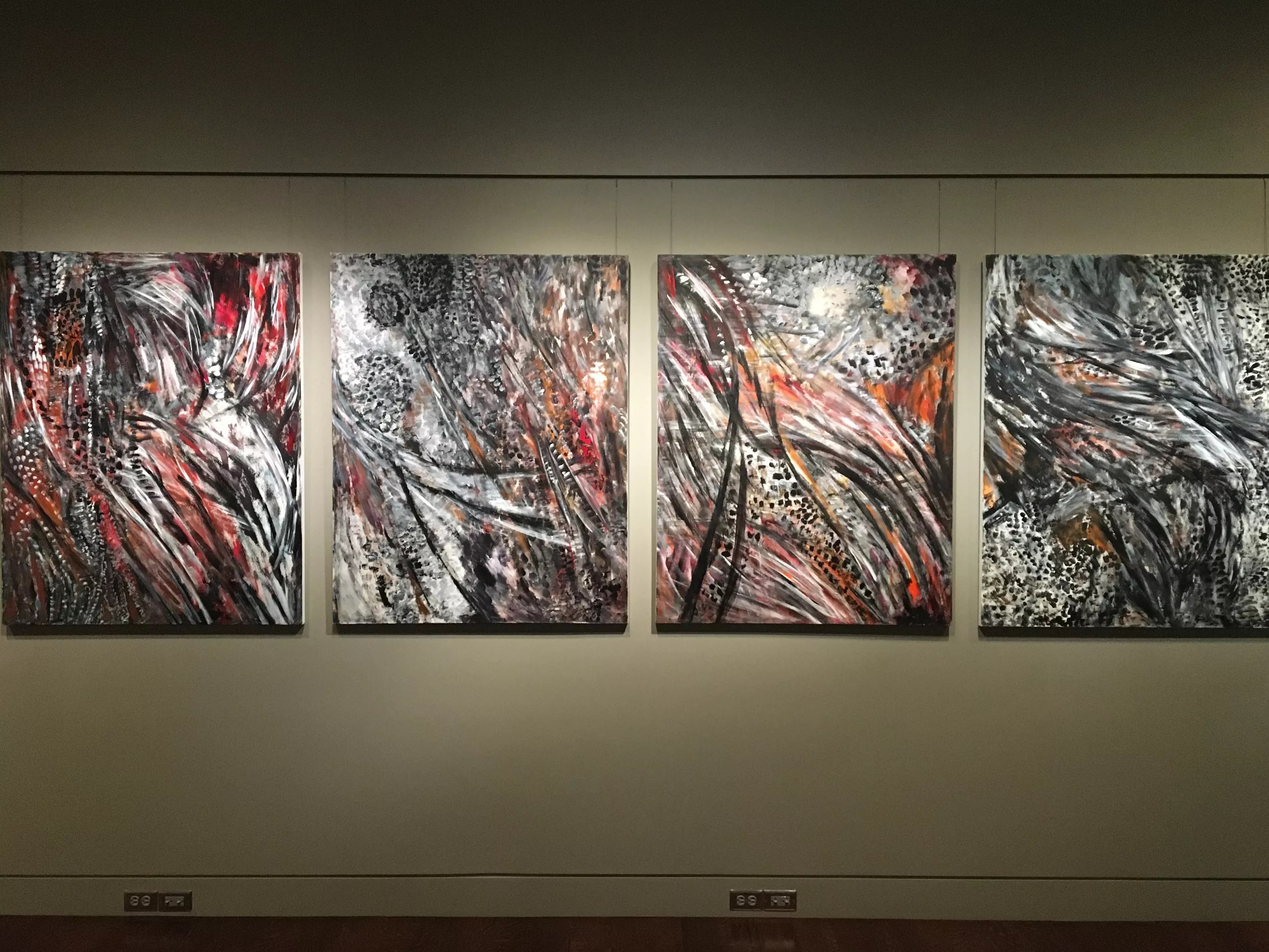 Bev Rosen’s four abstractions are among the most interesting works. A key figure in the development of the contemporary art scene in Denver, Rosen became afflicted with Alzheimer’s disease in the ’90s. Nevertheless, she continued to create, and these accomplished pieces are among those she painted after her diagnosis.