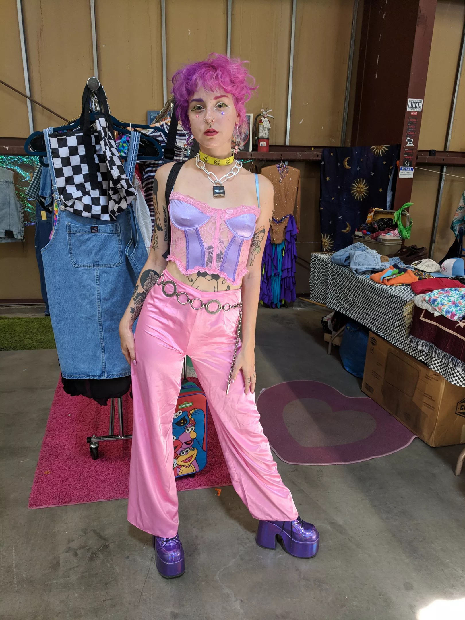 Ericks wears a top and shoes from Dolls Kill, with thrifted pants and a silver belt by Nine West.