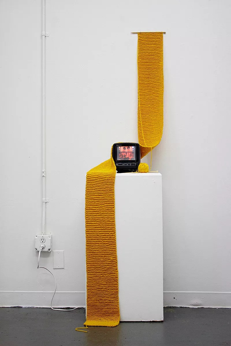 Mari Crespin, “Anxiety Scarf (Knit Yourself Clean),” video installation in Spivak Gallery, RMCAD, 2017.