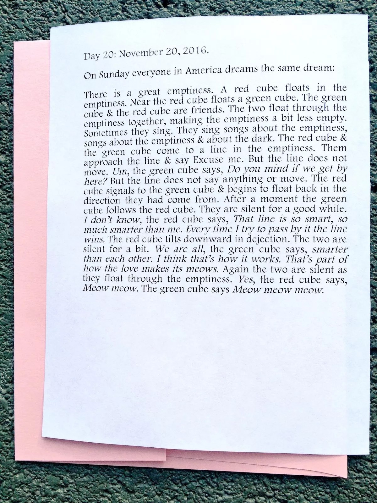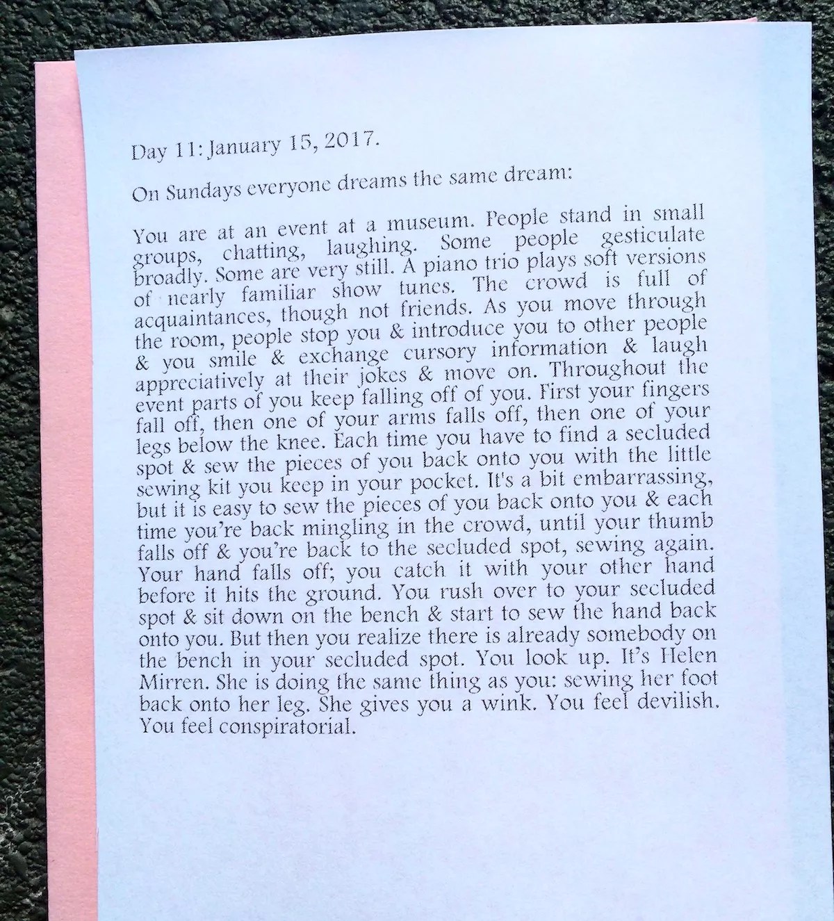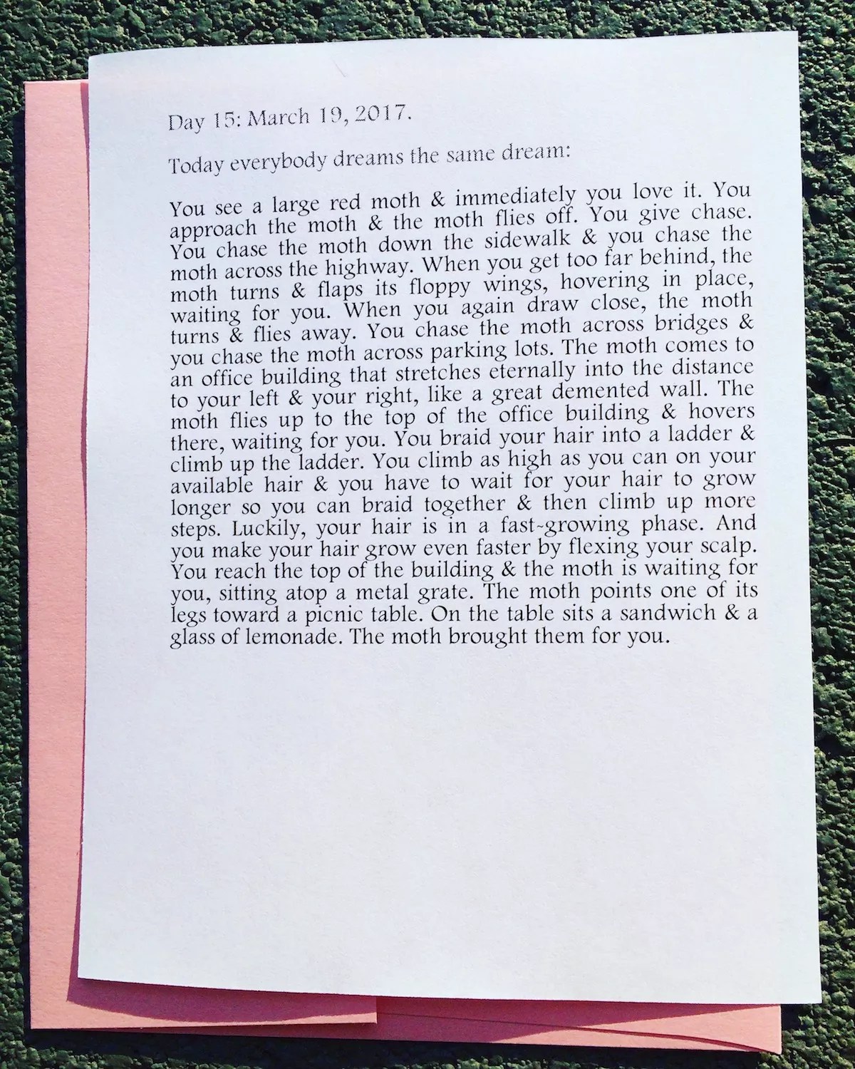 I am a dream deliveryman. I run a Dream Delivery Service. I take subscriptions and write and deliver dreams to subscribers every day for a month at a time. I spent 2016 and 2017 traveling around the country, delivering dreams in various American cities, and now I am back in Denver running the service out of the new Denver Theater District arts-incubator space, Understudy. During the months in which I deliver, I usually wake up around two or three in the morning and bike around town in the dark, dropping off little pink envelopes, containing dreams at people’s front doors. Around dawn I finish deliveries, and then I write dreams all day for the next morning’s deliveries.