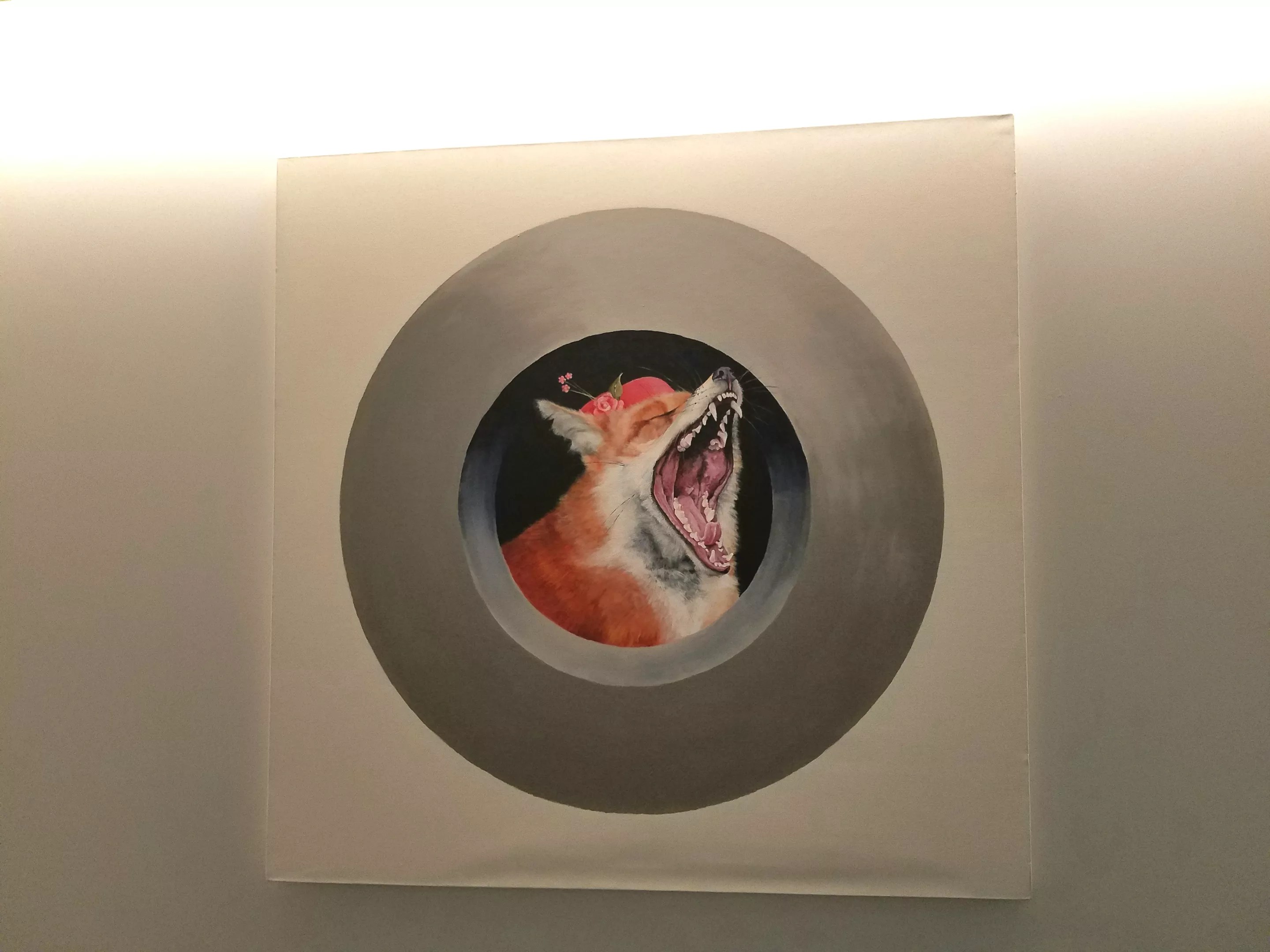 If you’re waiting for the elevator, take in the 300 black-and-white photos repurposed by artist Travis Hetman for his work “Dark Matter Gathering.” Each photo features a blast of star-scape cut into the picture to make it look as if it has always been there. Inside the elevator, check out the chalkboard-like sketches by Michael Dowling, renditions of such historical black-and-white images as a man riding a horse down 16th Street and a person tipping back a bottle of something refreshing. “Faith or Fashion,” by Heather Oelklaus. Linnea Covington “Margaret,” one of the foxes from Karrie York’s series. Linnea Covington