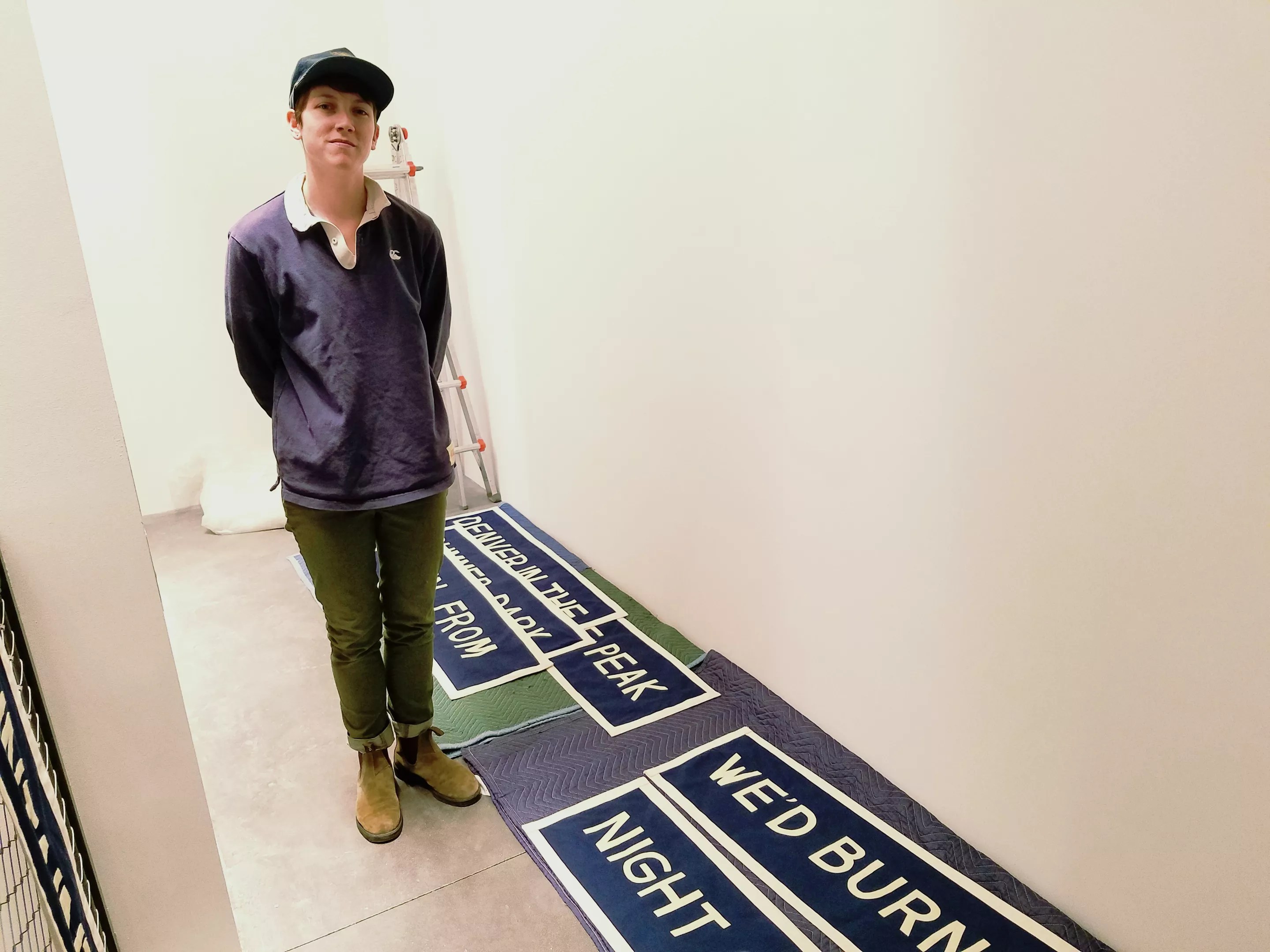 Artist Jackie Barry installing her stairwell piece.