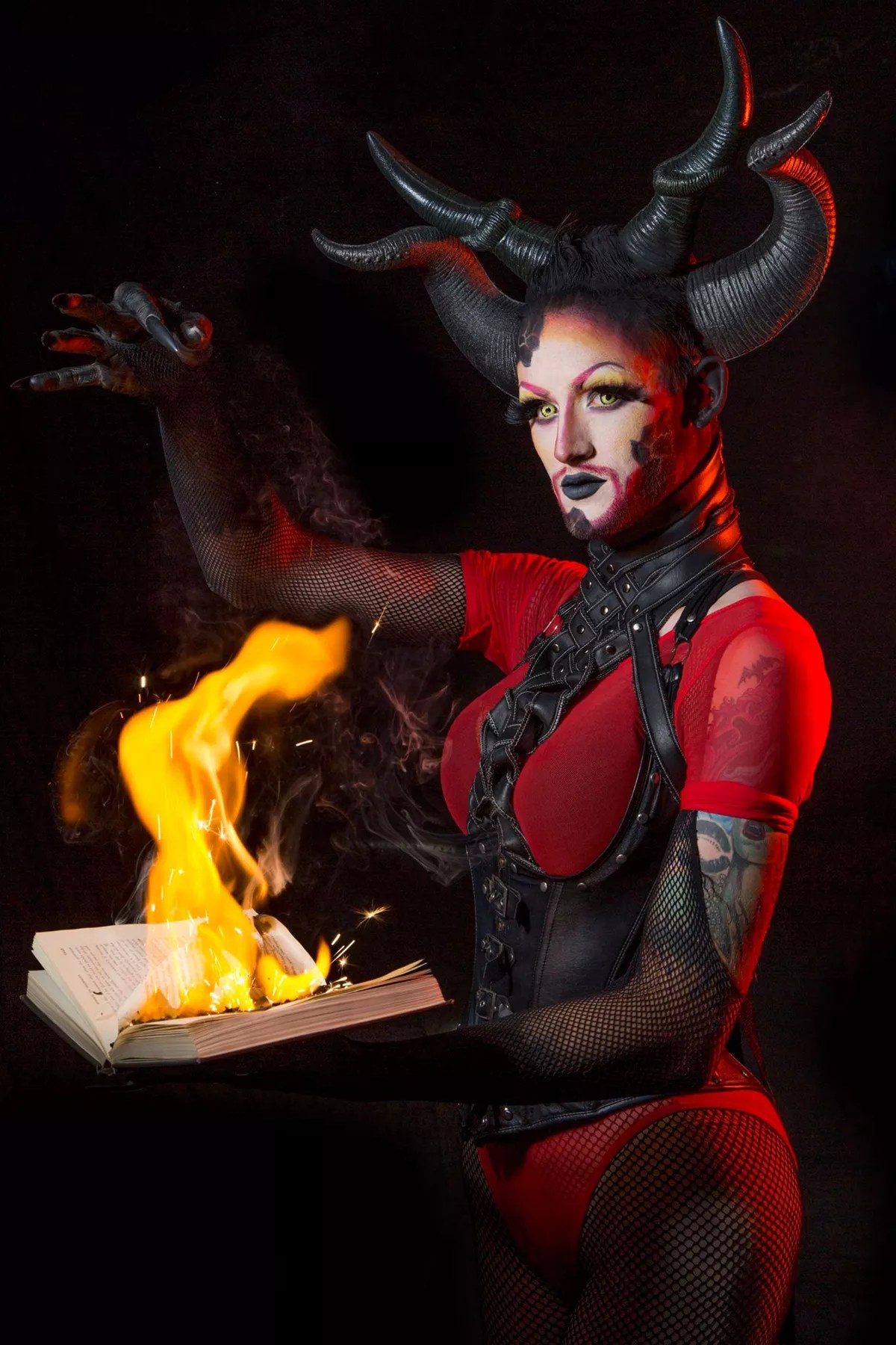 The origin of Mani Queen (aka Andrew Cronk, 24) oddly didn’t begin with a face at all. Mani was a performance concept, a living mannequin in a head-to-toe black bodysuit with no features save for a pair of brightly colored lips for syncing. That’s enough for a couple of numbers, but entering into the world of drag begs for a mastery of makeup arts and of creating multiple paintings over the same familiar canvas. When faced with this challenge, Mani dove in face first. She brought her existing painting skills to the forefront, creating a dark, beautiful creature that is equal parts gore and gorgeous. Once the face was freed from the bodysuit, the rest of her body followed – except for her knees. Andrew was born without knee caps, which you’d never know by watching her high-heeled fantastical performances. Drag can exacerbate her leg strain, kicking up her feet, whether they’re in ten-inch heels or cloven hooves. As a member of the Haus of Lost Causes, Mani is turning her whole life into a work of art.