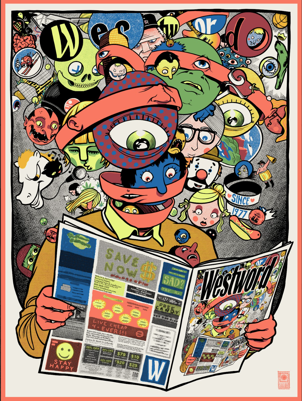 Since Moonlightspeed is so well-versed in screenprinting, he thought about what would look good on a poster or shirt while he was coming up with the design. “Dude, it’s absolute chaos,” he says of the resulting illustration. “…I wanted to draw this entity that is looking at Westword and all these personalities that represent all these new personalities in Colorado now. Over the past decade, it’s really grown from being the cow town that I grew up in.”