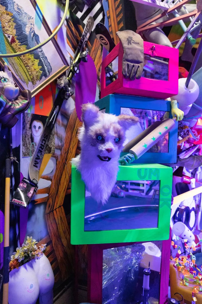 They didn’t build the ride from scratch. Kaleidoscape is a remodel of Ghost Blasters 2, which has been at the amusement park since 2008. Kaleidoscape runs on the same tracks, uses the same carts and even the same guns from the original ride. Other sculptural elements of Ghost Blasters 2 were incorporated into Meow Wolf’s ride, while most of the installation is original to this piece.