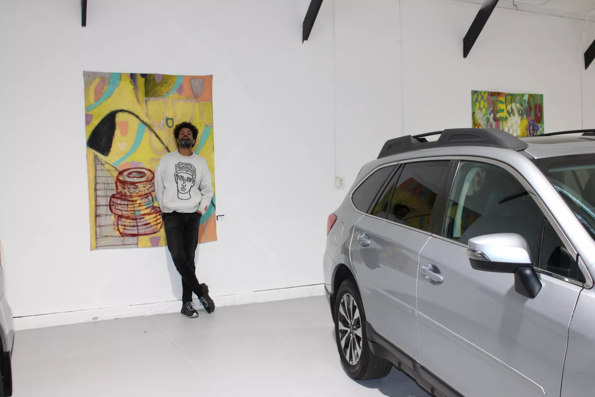 It’s not every day you find paintings and Subarus sharing a stage, but Michael Gadlin‘s art seems right at home at Frisian Motors Auto Gallery in RiNo. The juxtaposition is striking: sleek cars gleam under bright showroom lights, while Gadlin’s vibrant canvases — raw and unframed — invite viewers into a world deeply connected to his past.