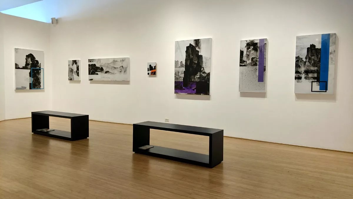 Around the corner in the back gallery is the other solo, Andrew Roberts-Gray: Processor. A Glenwood Springs-based artist, Andrew Roberts-Gray has been interested in playing with the Western landscape tradition in painting. Over the past few years, Roberts-Gray has created realist paintings with abstract interventions, as well as whitewashed depictions of scenic vistas with added sculptural elements. For these latest works, he used sandblasted plastic mirrors, on which he silkscreened an image of an early computer processor and an image of the Hindu god Ganesh, then painted a simple brushy landscape in liquid acrylic on top. The landscape is barely suggested, conveyed by wide marks and some almost-hidden found objects, notably metal processors.