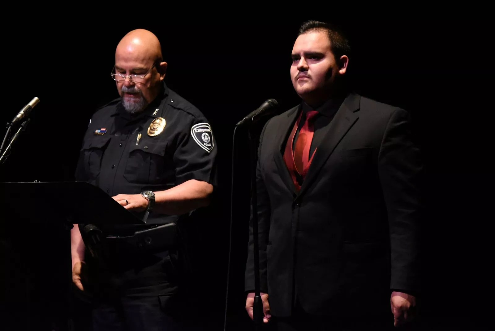 Lafayette Police Chief Rick Bashor and Victor Galvan perform during Motus Theater’s 2017 Law Enforcement Leaders Read DREAMER Stories.